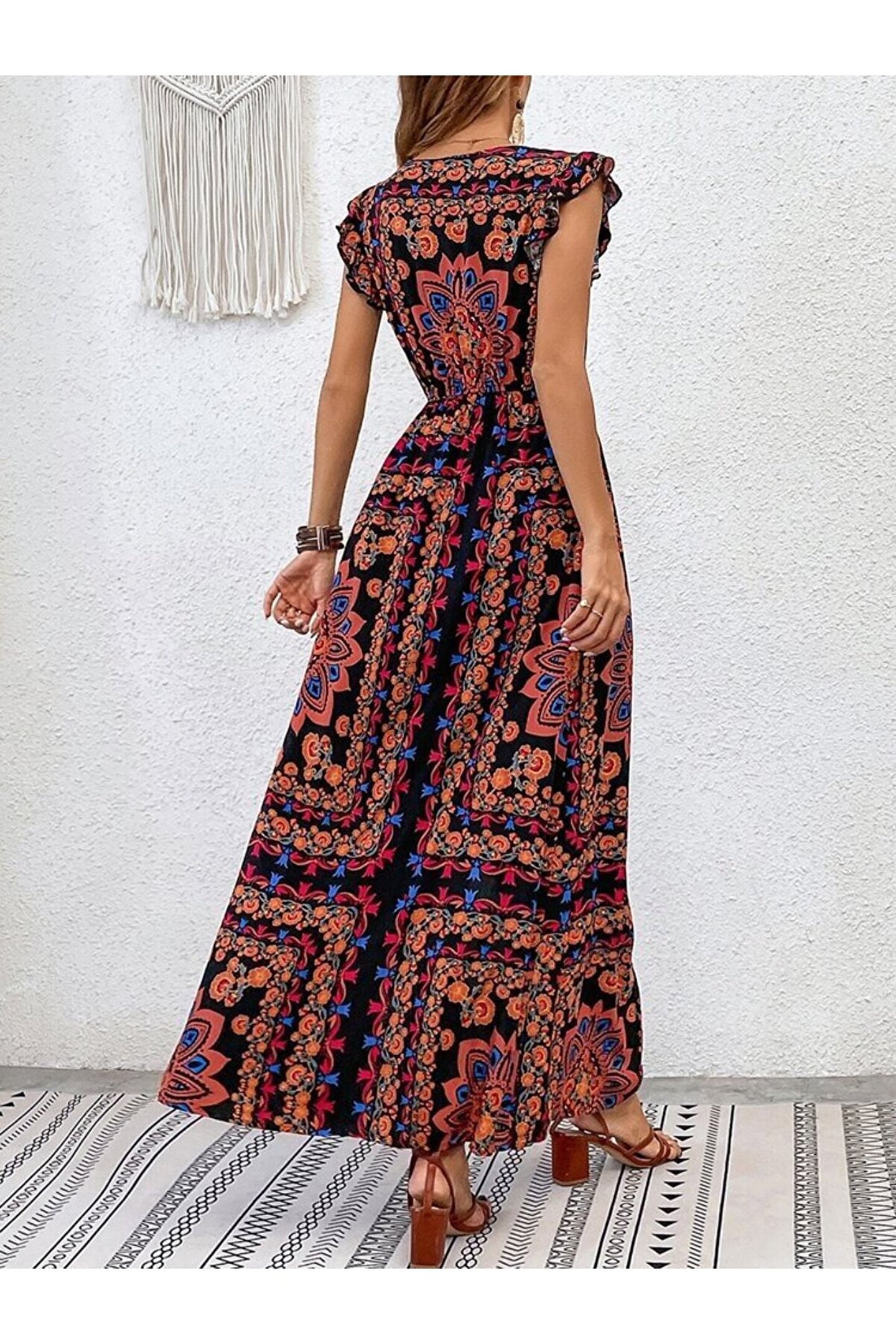 BEFAON EQURİ Kadın Kısa Kollu V Yakalı Deseni Yırtmaçlı Süprem Elbise