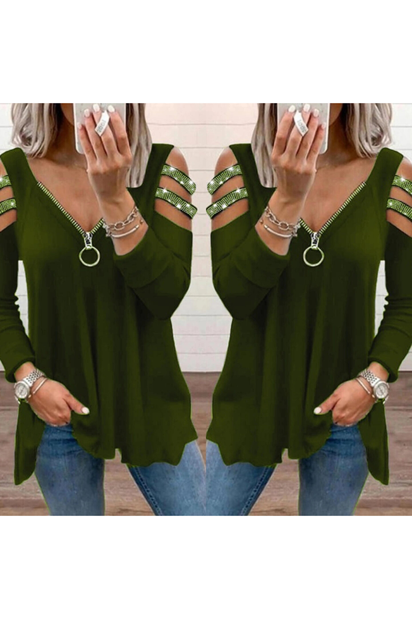 Kadın Haki Kolları Taş Işlemeli Uzun Kol Fermuarlı Viskon Bluz