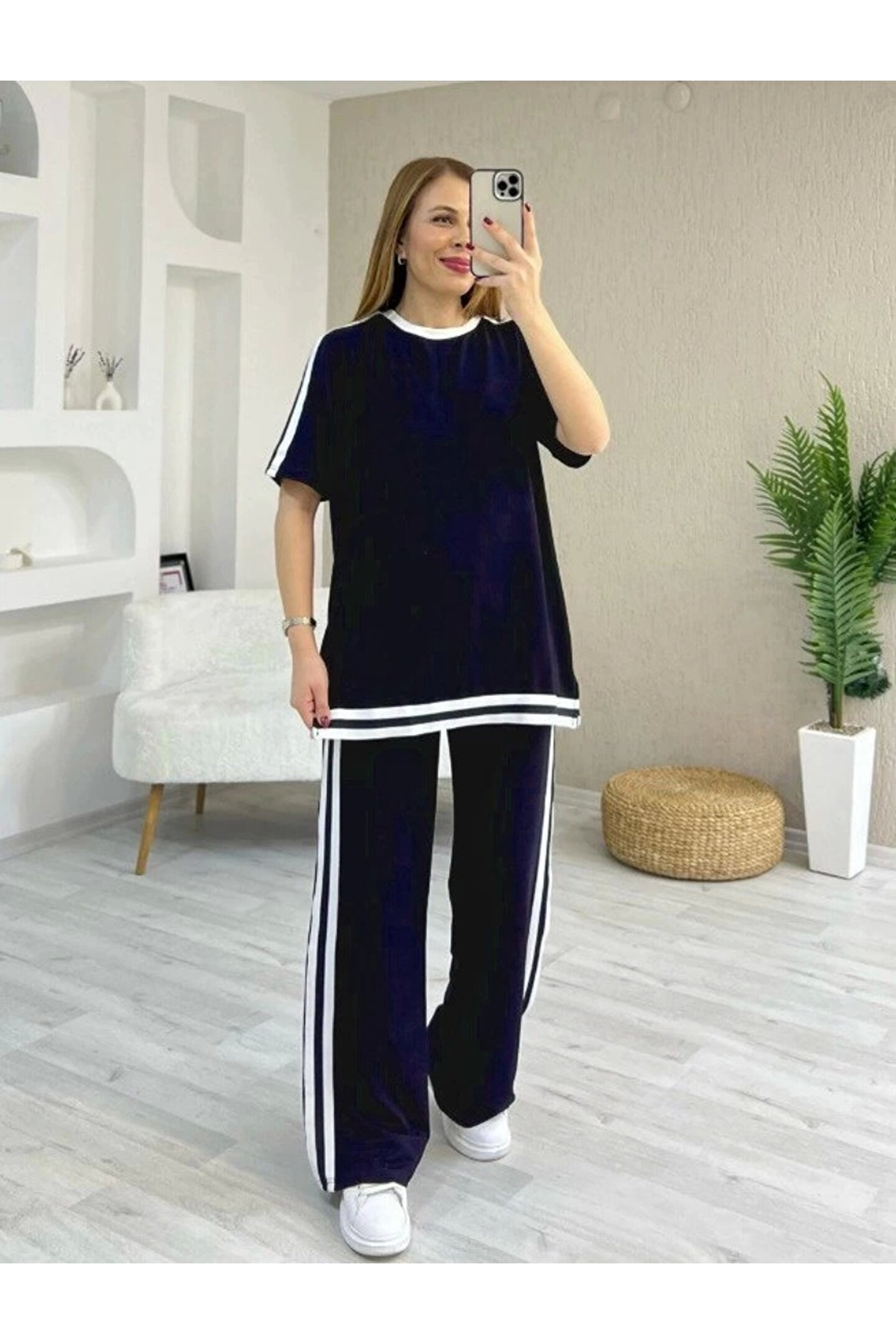 Kadın Kısa Kollu Bisiklet Yaka çift Renk şerit Detaylı Viskon Iki Iplik Bluz Ve Pantolon Ikili Takım