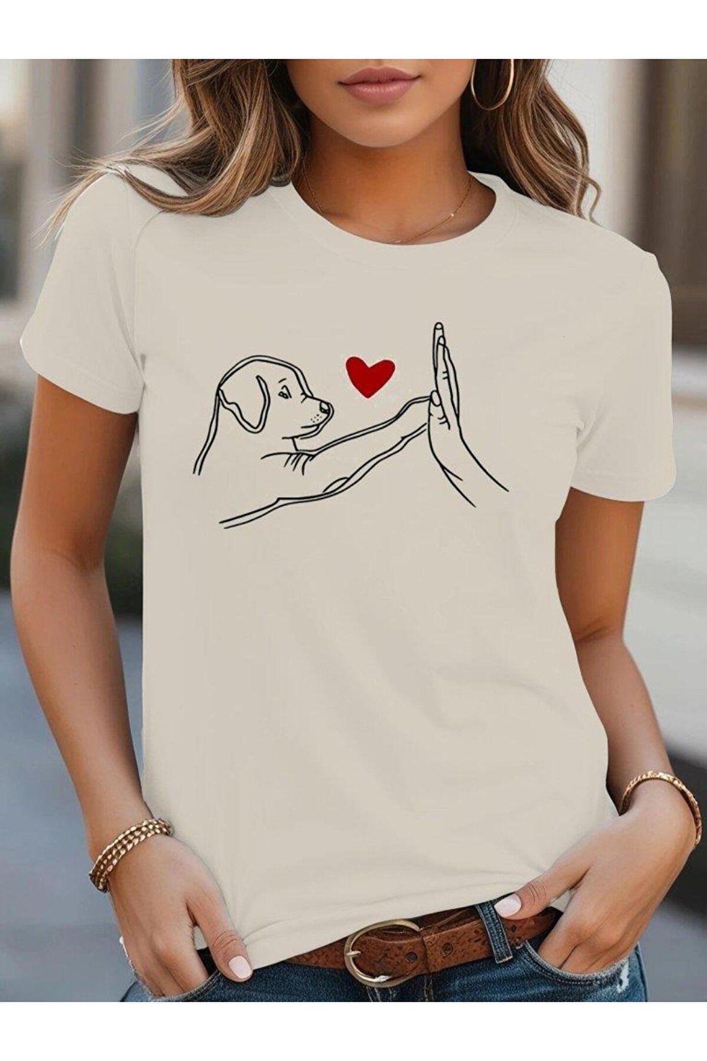 BEFAON Kadın Kısa Kollu Bisiklet Yaka Köpek Baskılı Viskon Bluz