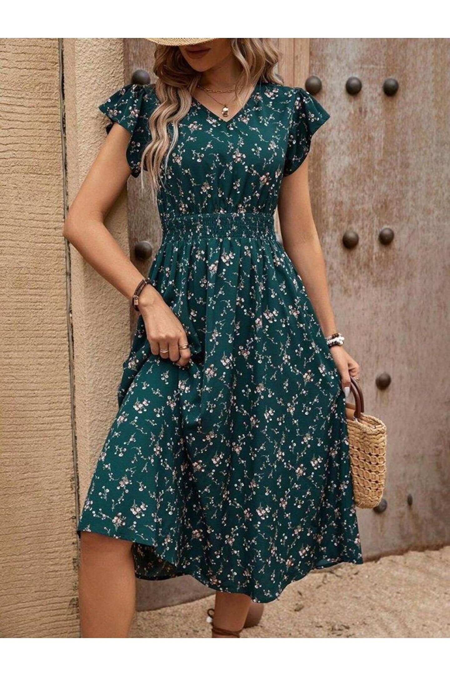 Kadın Kısa Kollu V Yakalı Beli Lastikli çiçek Desenli Süprem Elbise