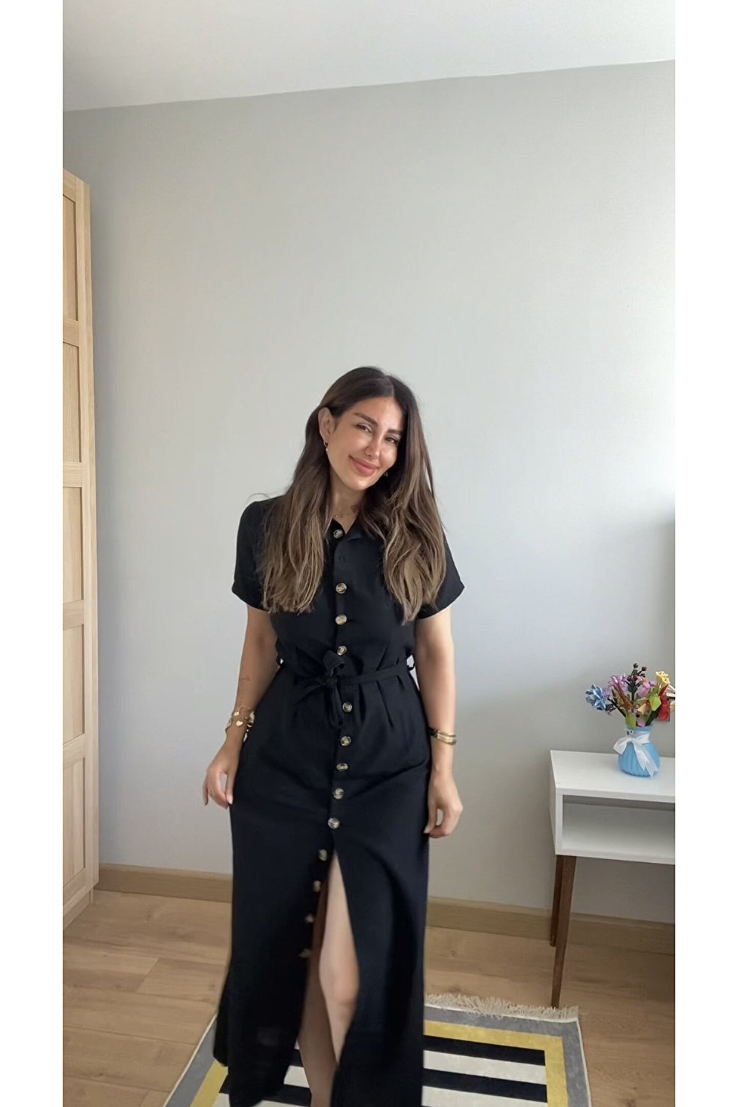 Kadın Kısa Kollu Yakalı önden Düğmeli Beli Kuşaklı Ithal Keten Elbise