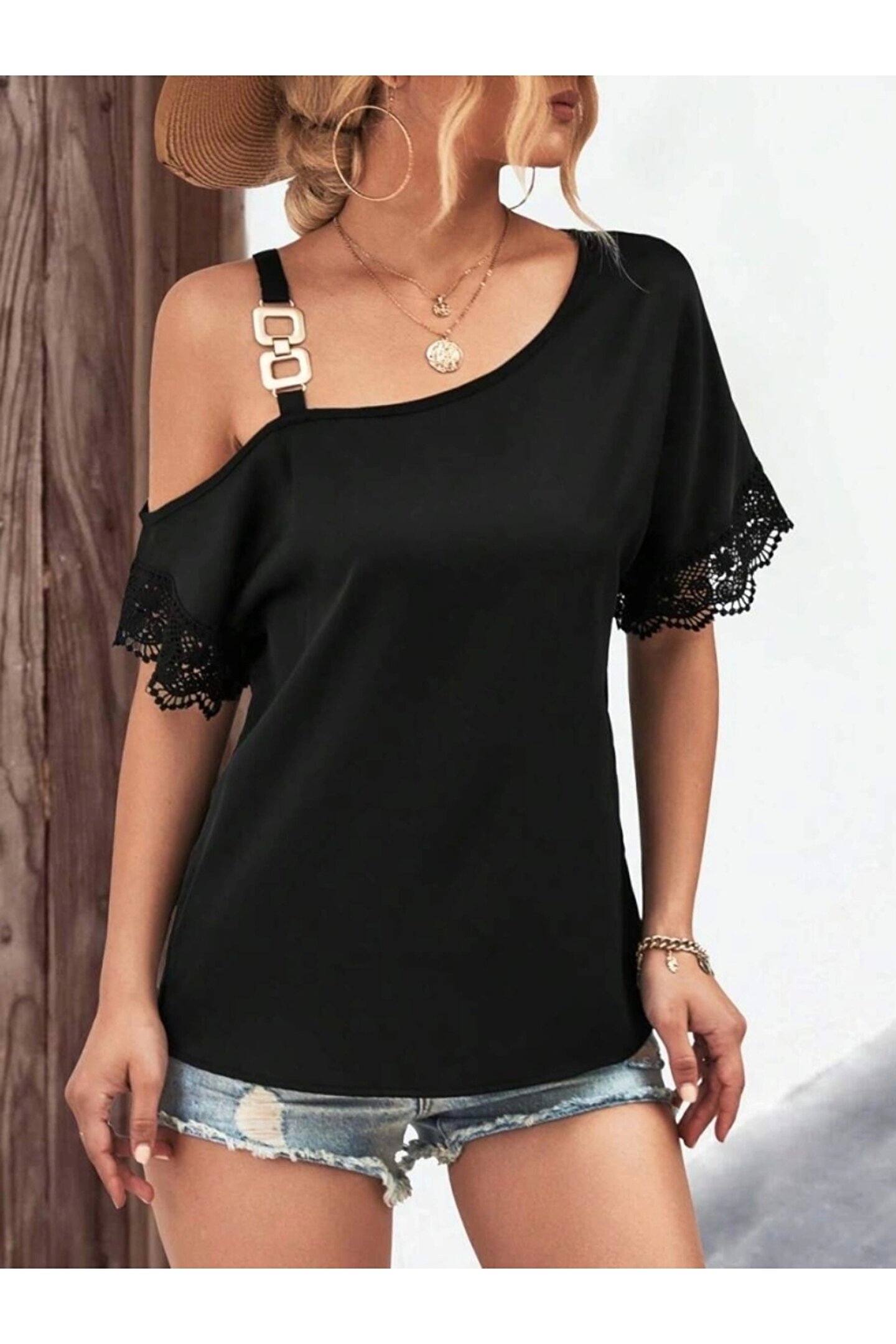 BEFAON Kadın Tek Omuzu Askılı Kısa Kollu Toka Detaylı Dantelli Viskon Bluz