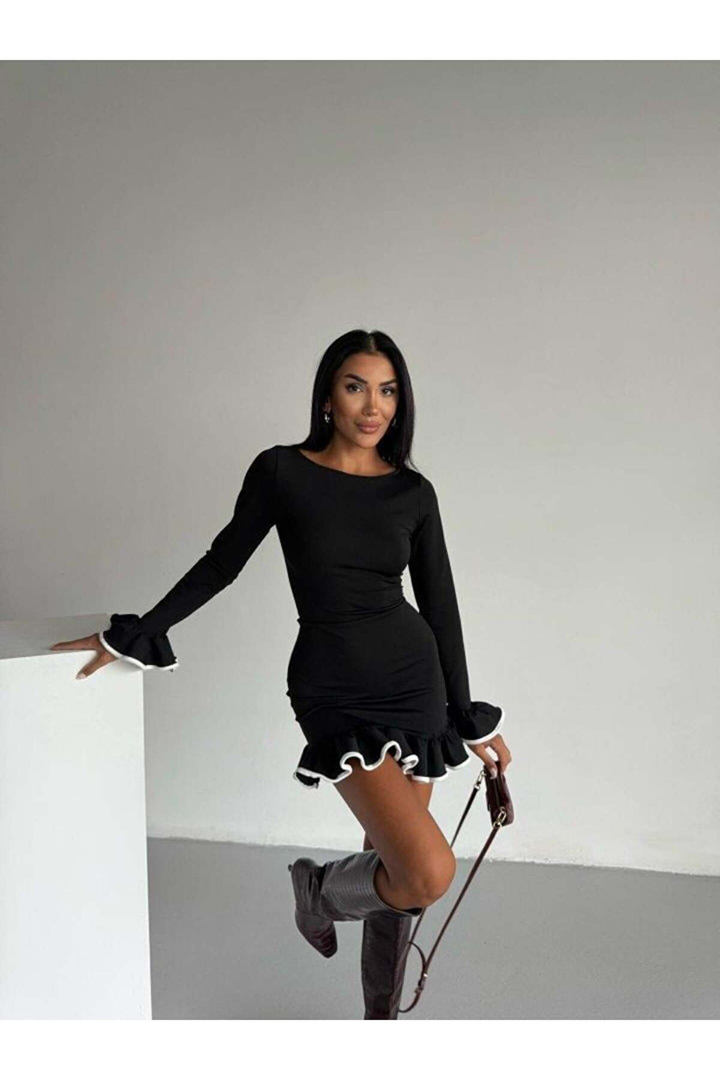 Kadın Uzun Kollu Biye Ve Volan Detaylı Dalgıç Kumaş Mini Elbise