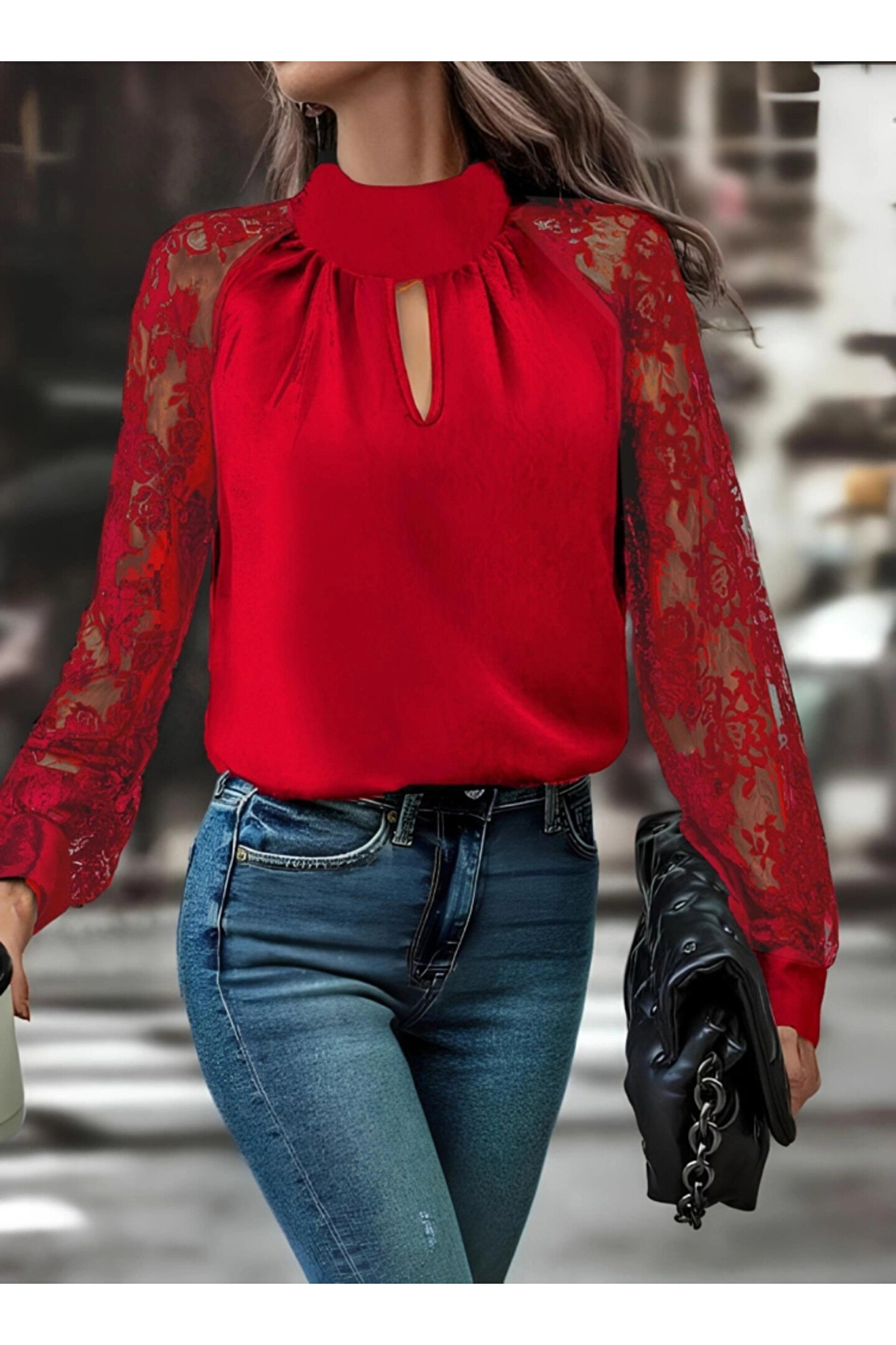 Kadın Uzun Kollu Göğüs Pencere Detay Yaka Boğazlı Kolları Tüllü Sandy Bluz