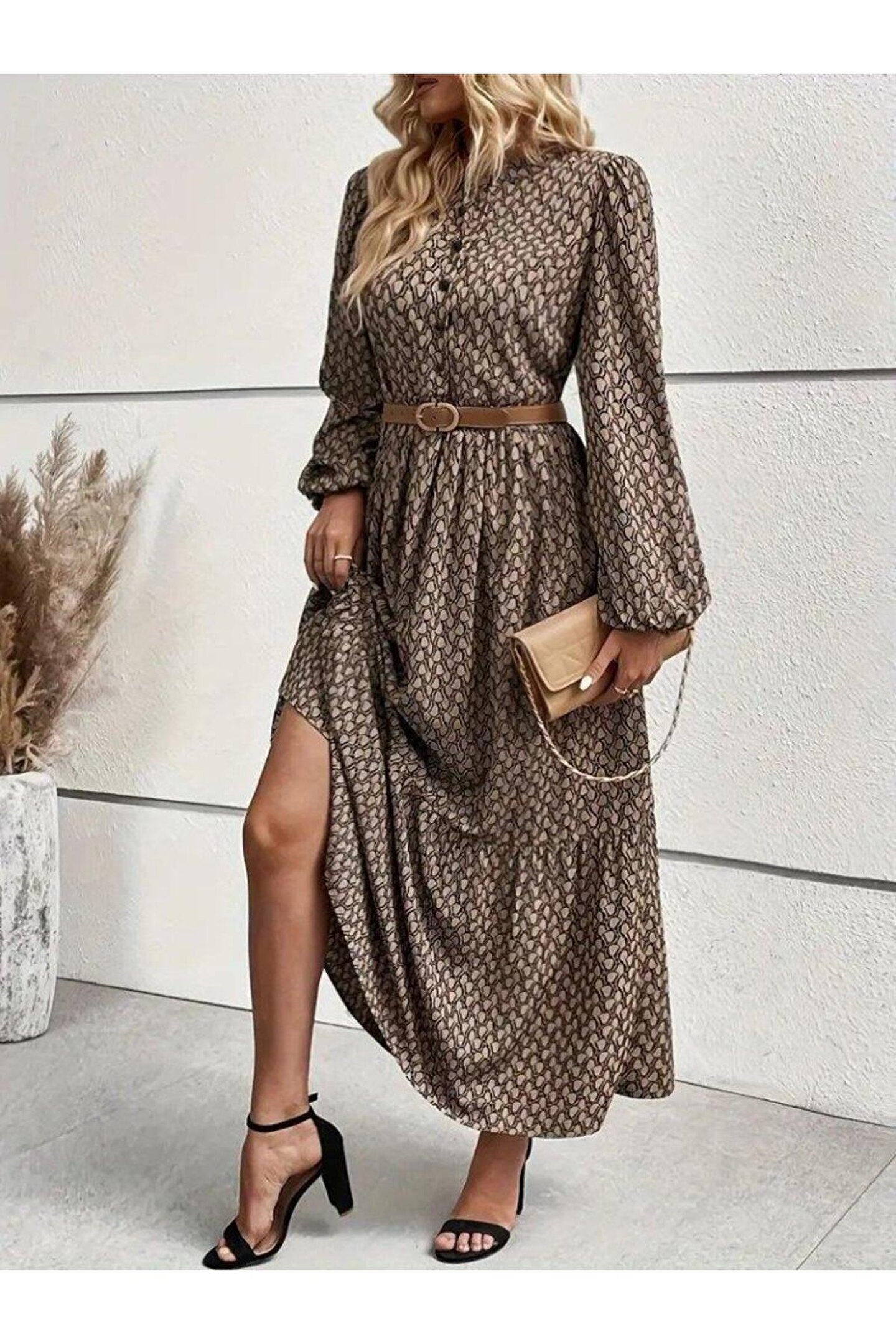 BEFAON Kadın Uzun Kollu Hakim Yakalı Düğmeli Kemersiz Desenli Maxi Süprem Elbise
