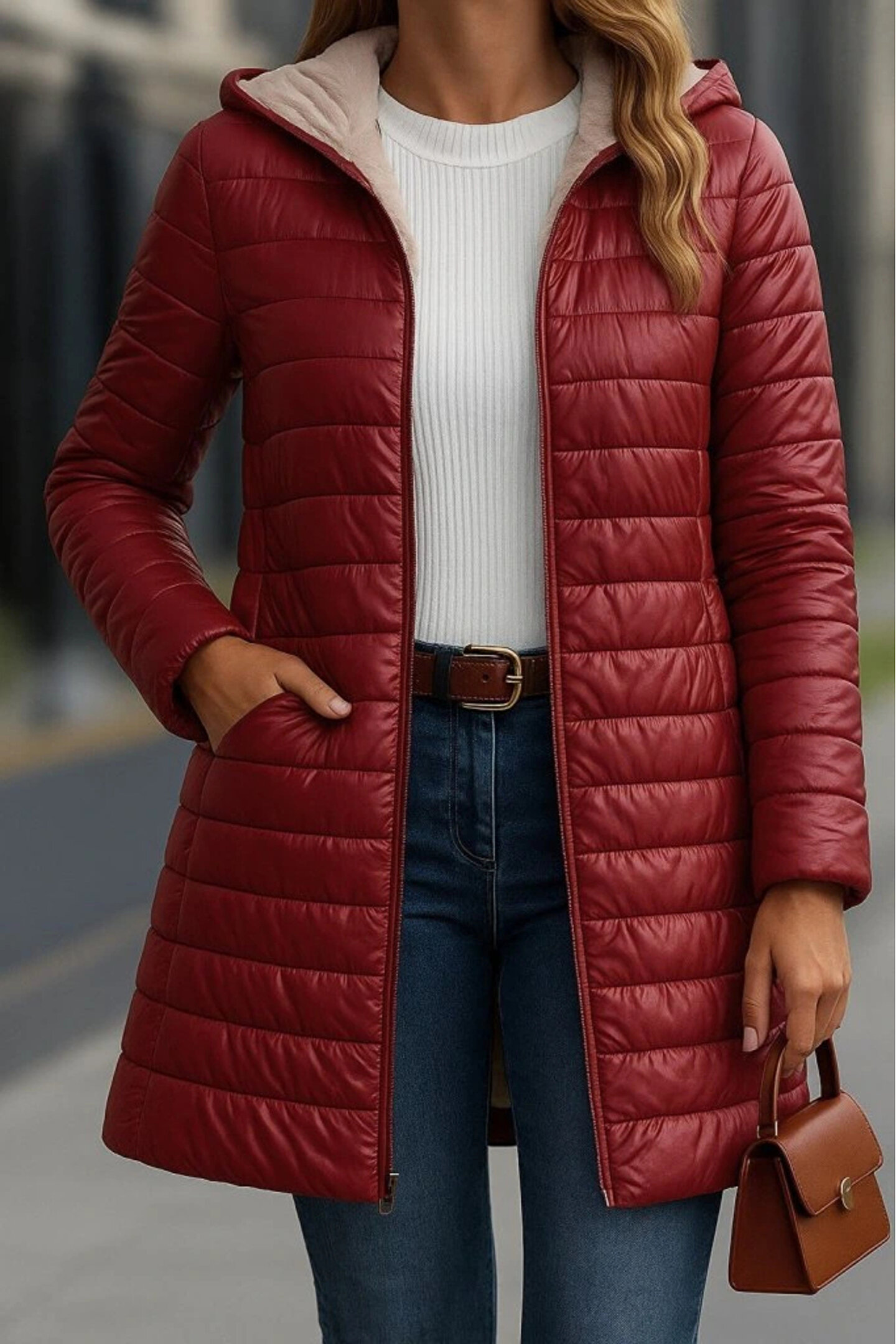 BEFAON Kadın Uzun Kollu Kapşonlu Cep Detaylı Fermuarlı Orta Boy Mont