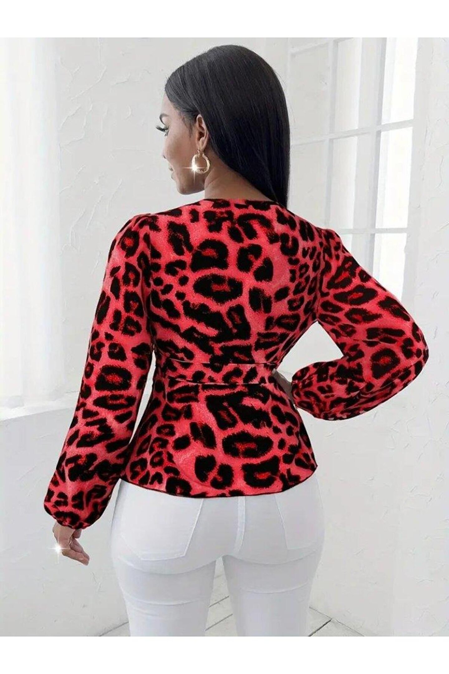 BEFAON Kadın Uzun Kollu Kruvaze Yakalı Belden Kuşaklı Leopar Desenli Süprem Bluz