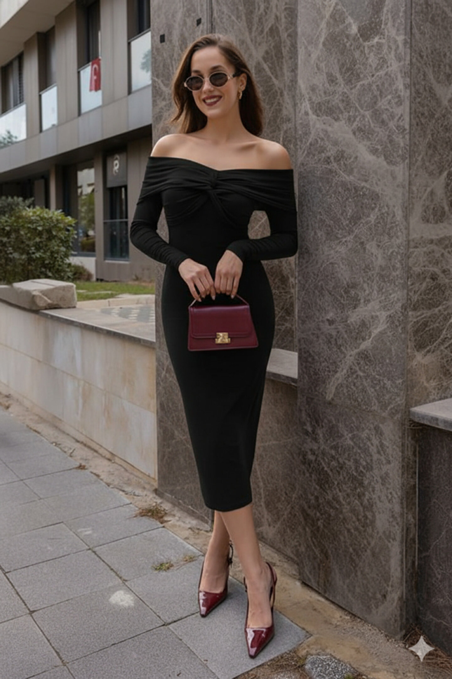 BEFAON Kadın Uzun Kollu Madonna Yaka Düğüm Büzgü Detay Maxi Boy Elblbise