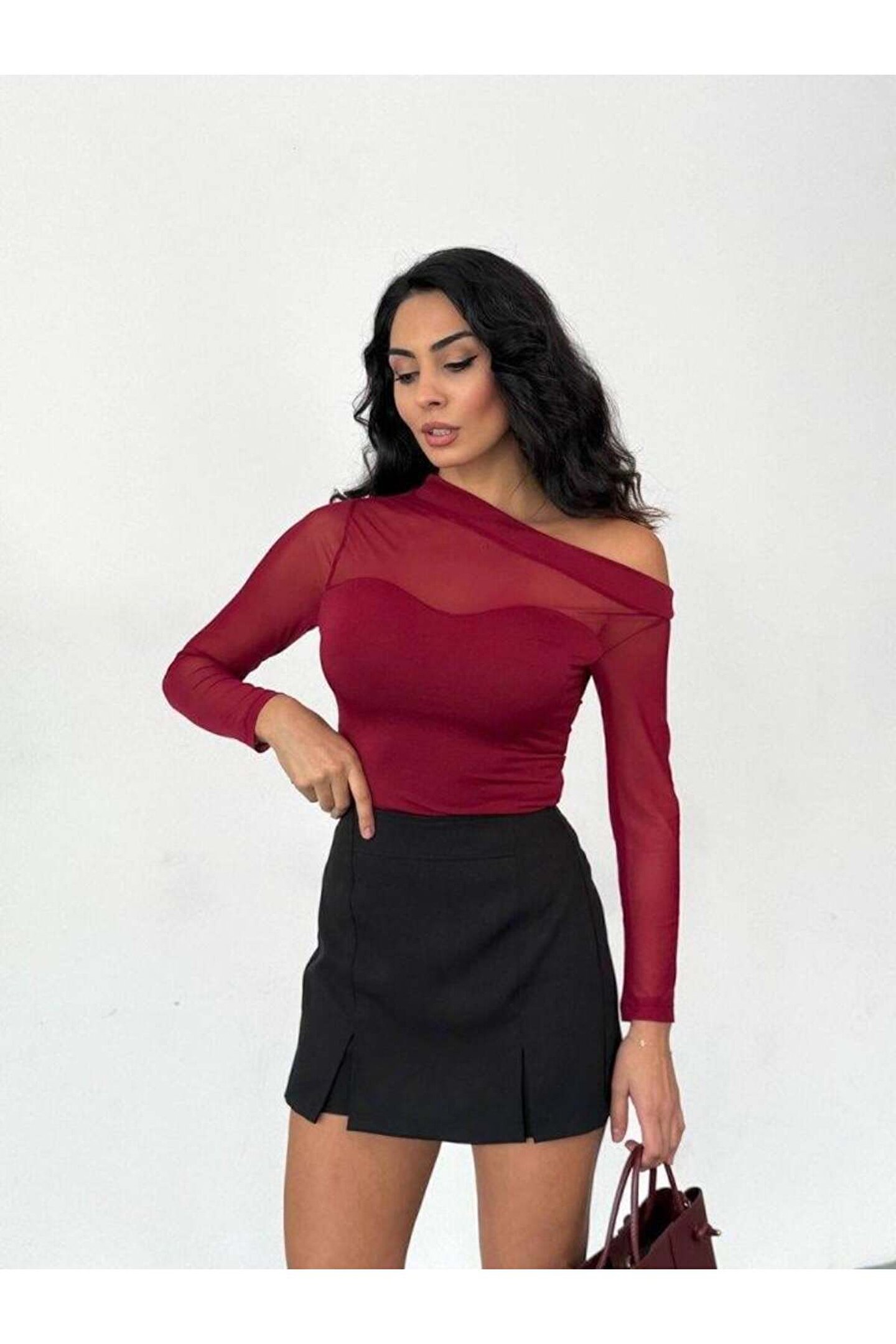 Kadın Uzun Kollu Omuz Dekoltesi Ve Transparan Tül Detay Bluz