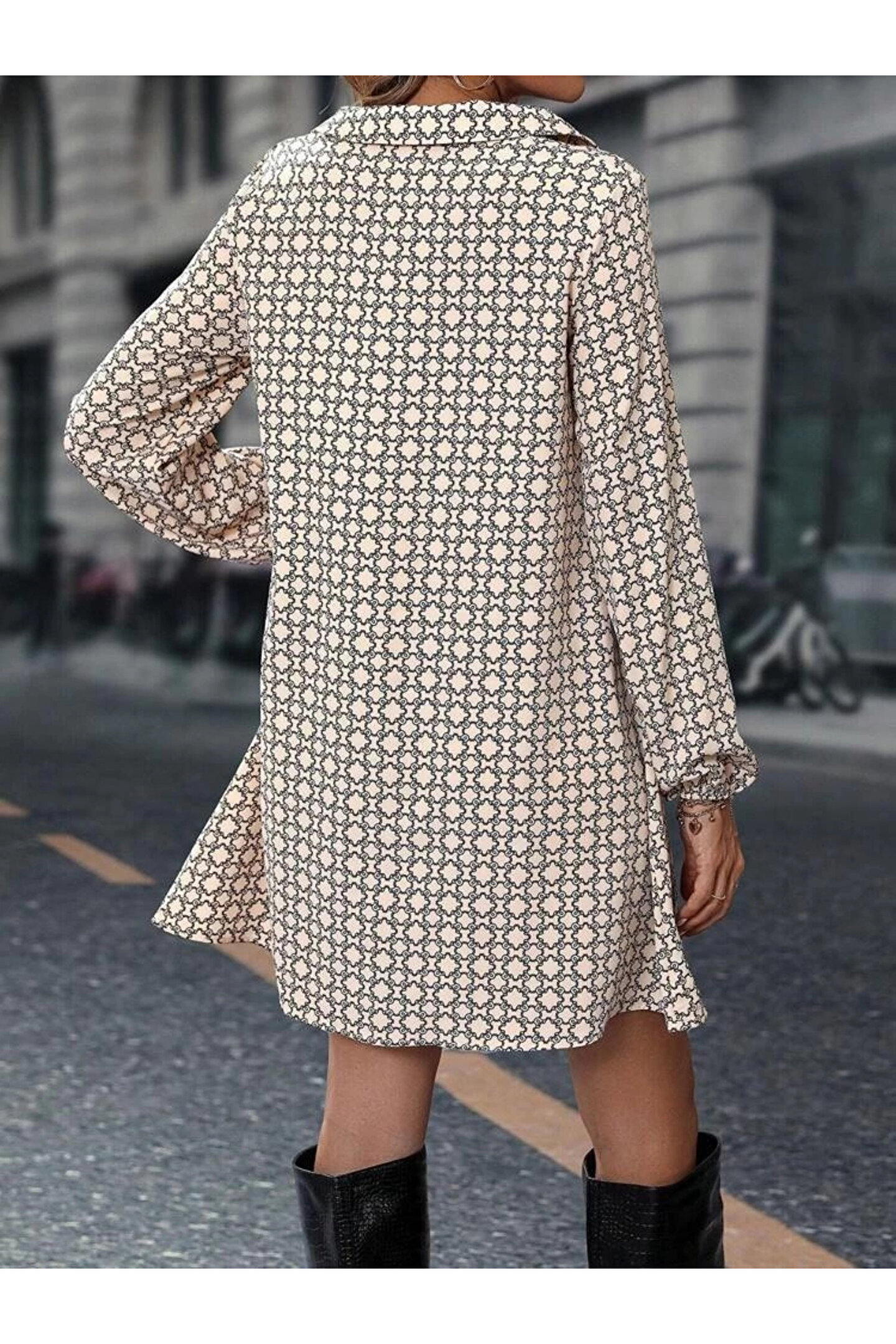 Kadın Uzun Kollu Yakalı Desenli Mini Modal Elbise