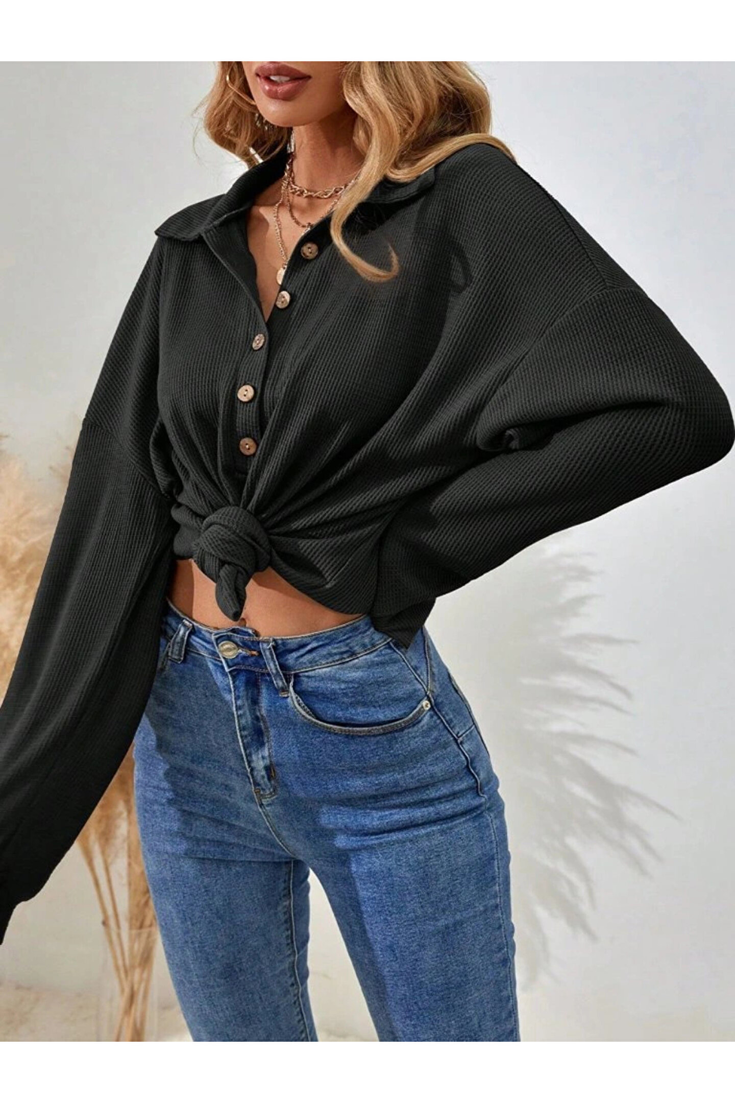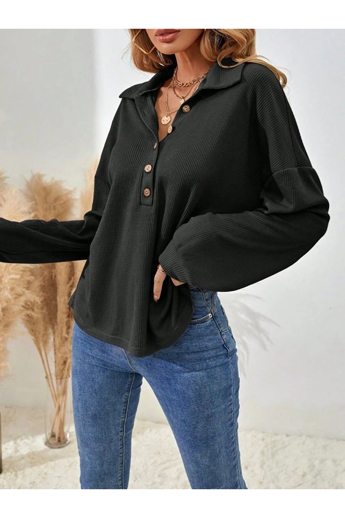 Kadın Uzun Kollu Yakalı Düğmeli Salaş Waffle Bluz