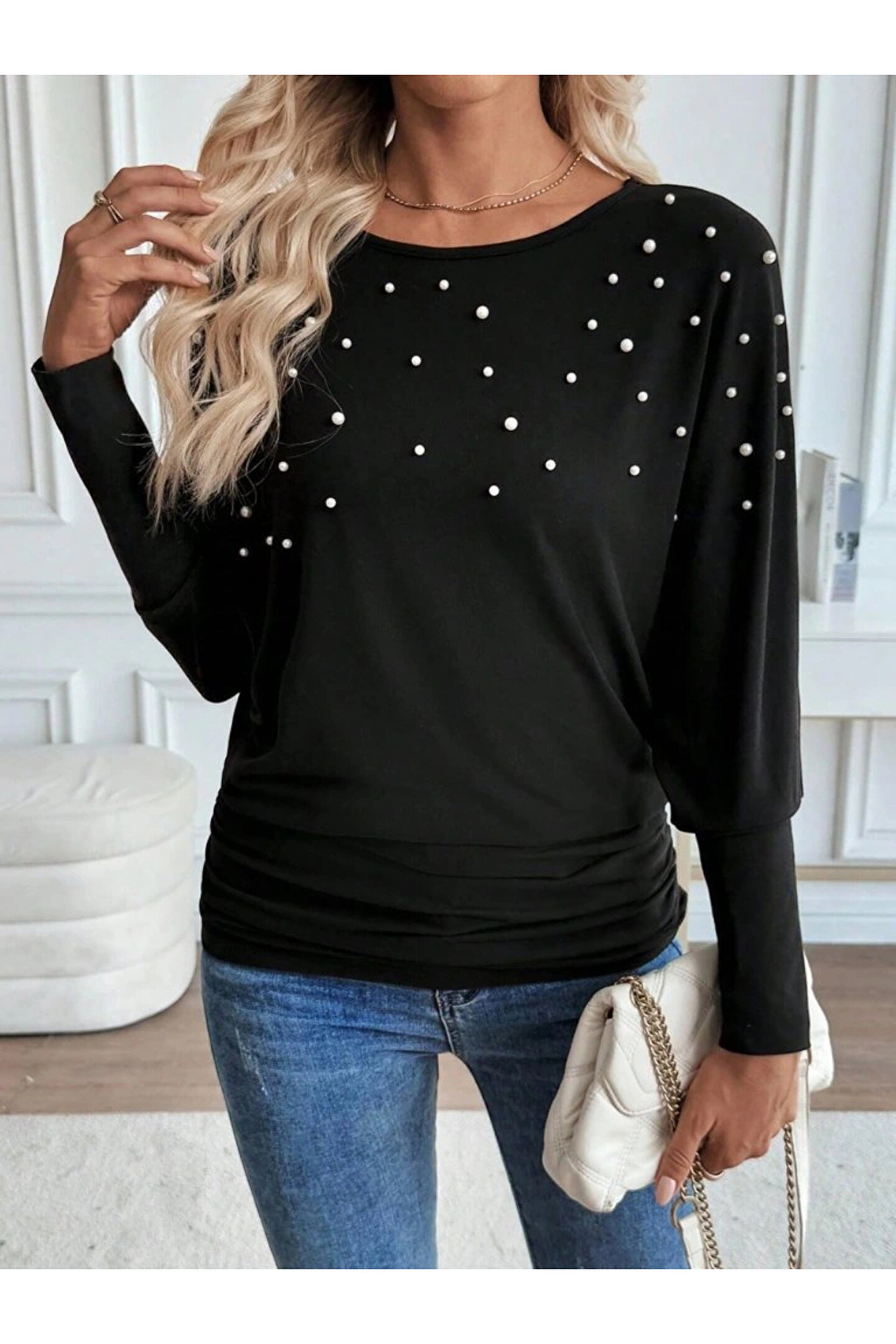 Kadın Uzun Kollu Yuvarlak Yaka Incili Viskon Bluz