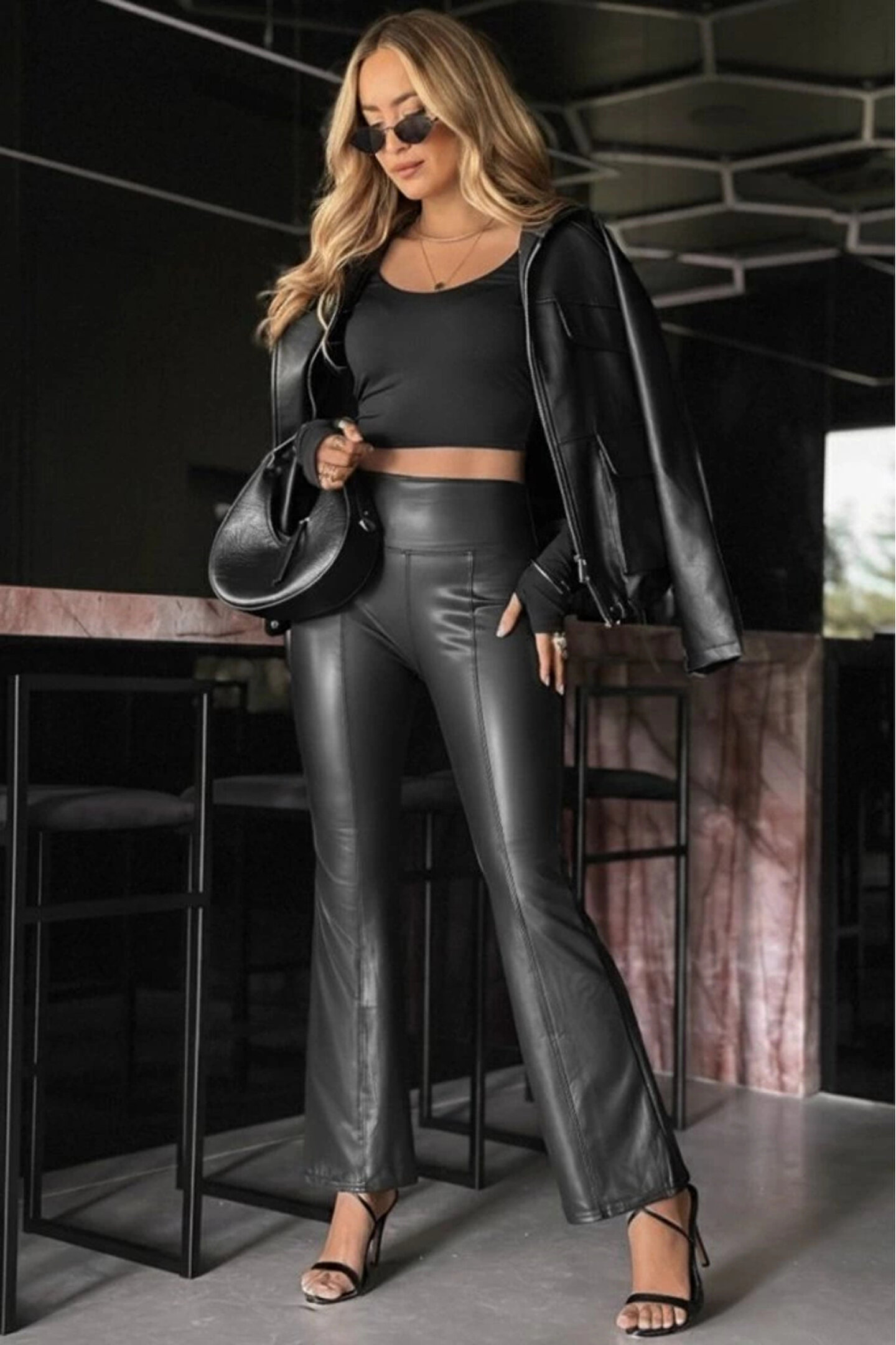 Kadın Yüksek Bel Paçaya Doğru Geniş Deri Pantolon