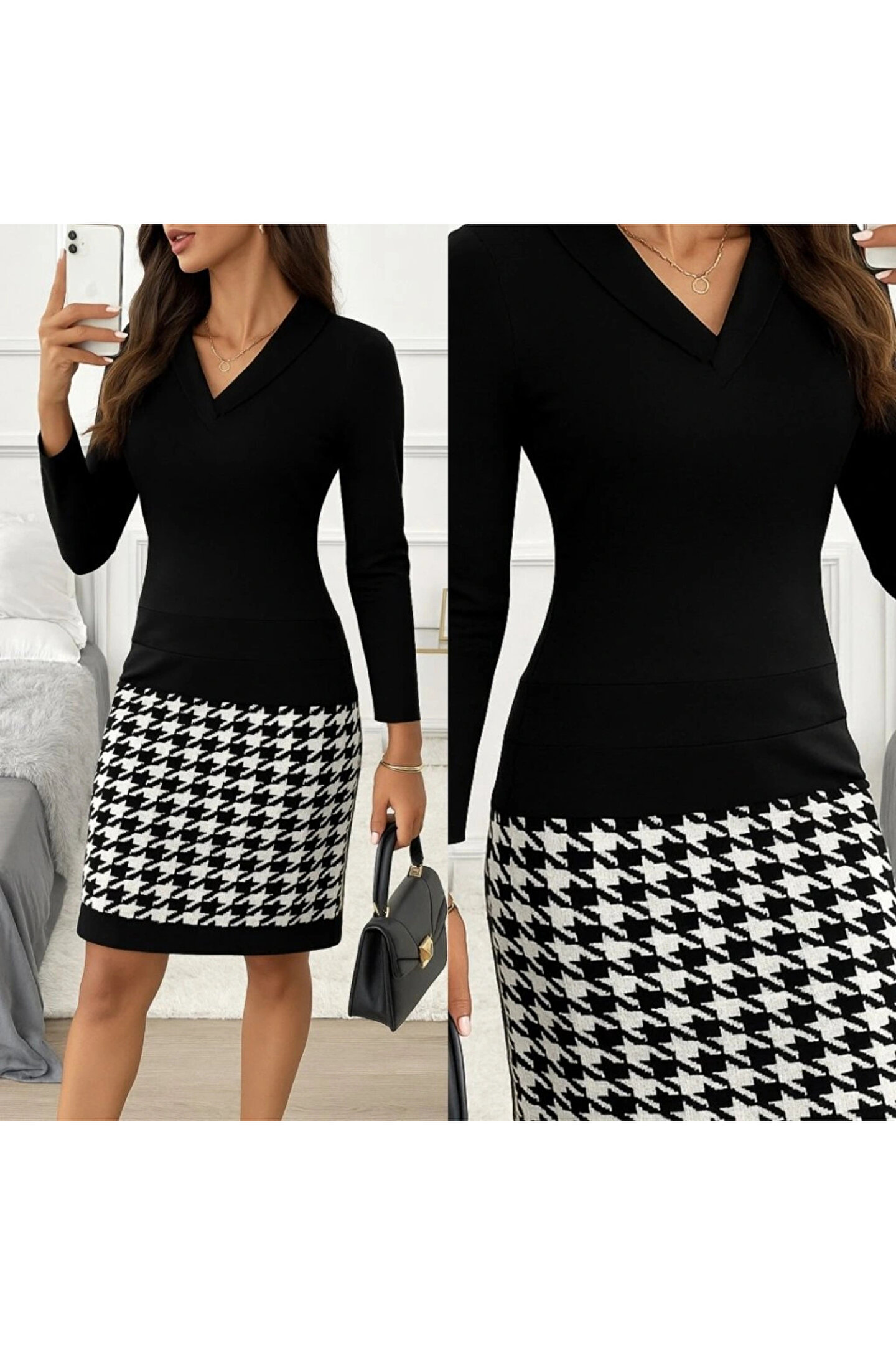 BEFAON MDB Kadın Uzun Kollu V Yaka Alt Tarafı Desenli Dalgıç Mini Boy Elbise
