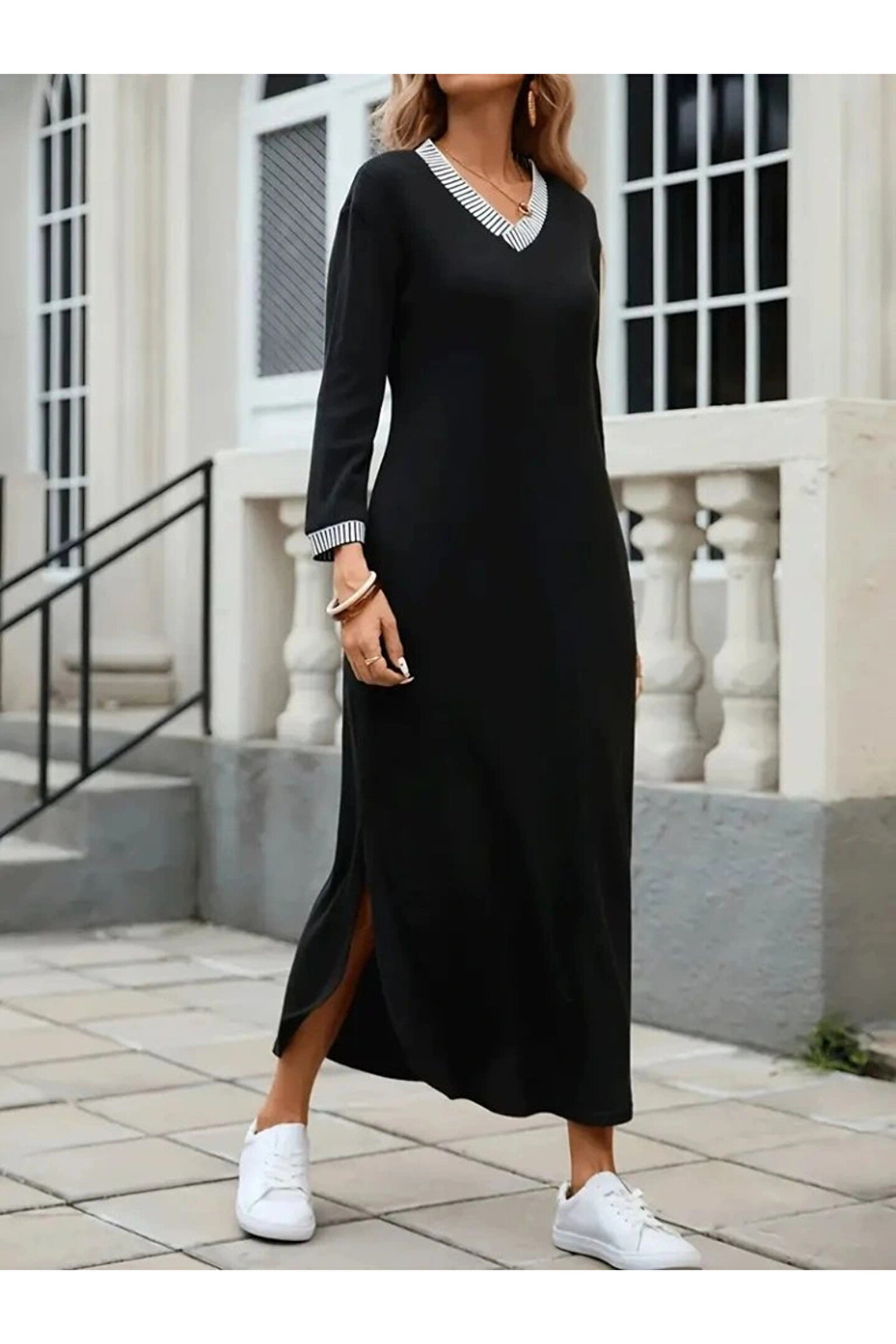 Kadın Uzun Kollu V Yakalı Yanlardan Yırtmaçlı Uzun Viskon Iki Iplik Elbise