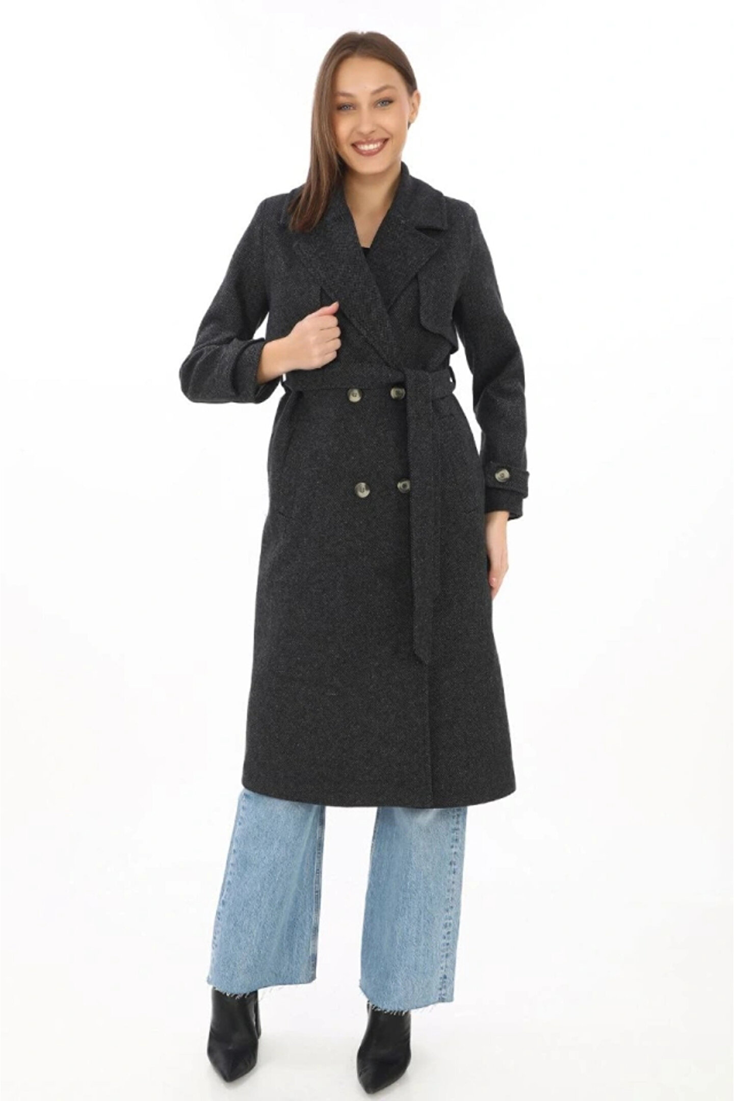 BEFAON Premium Kaşe Kaban Uzun Boy, Balık Sırtı Yünlü Kaşmir Dokuma, Kruvaze Kuşaklı Astarlı - Siyah