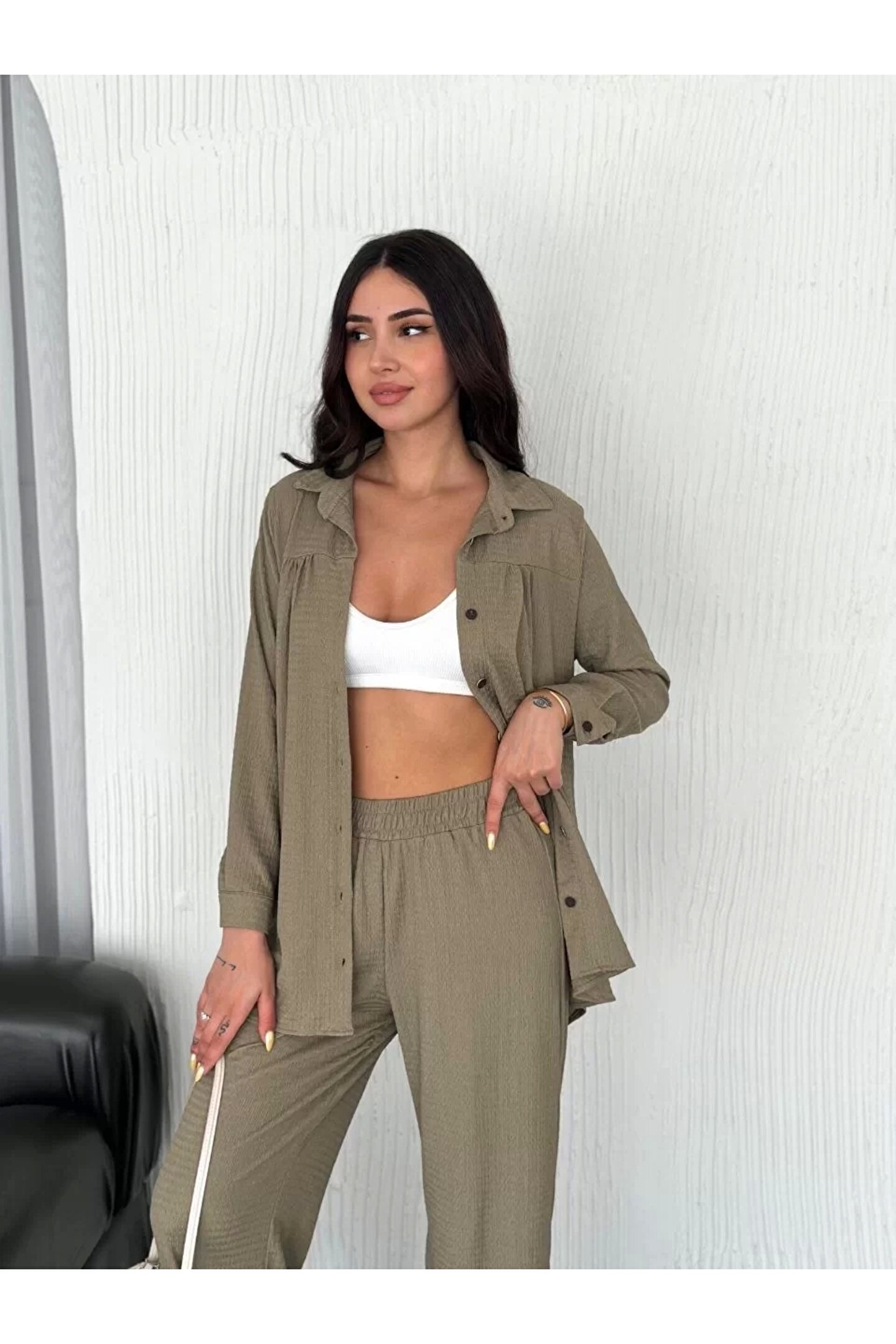 BEFAON Yakalı Düğmeli Uzun Kollu Gömlek Pantolon ikili Takım - Bej
