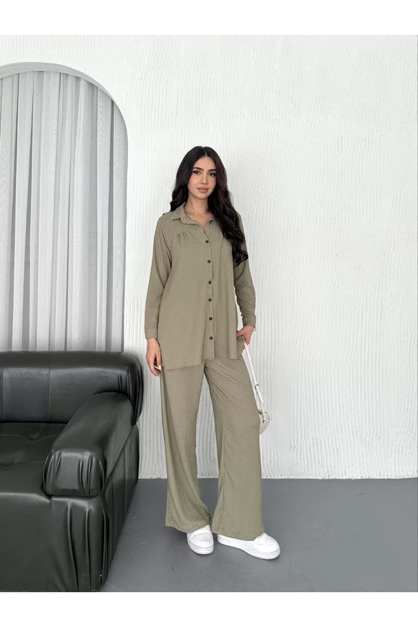 Yakalı Düğmeli Uzun Kollu Gömlek Pantolon Ikili Takım - Bej