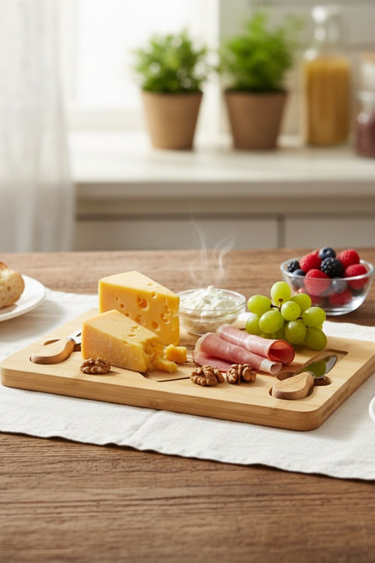 Ergonomik ve Düzenli: Peynir bıçakları için ayrılmış özel oyuklar sayesinde servis araçlarınız her zaman elinizin altında ve düzenli durur.