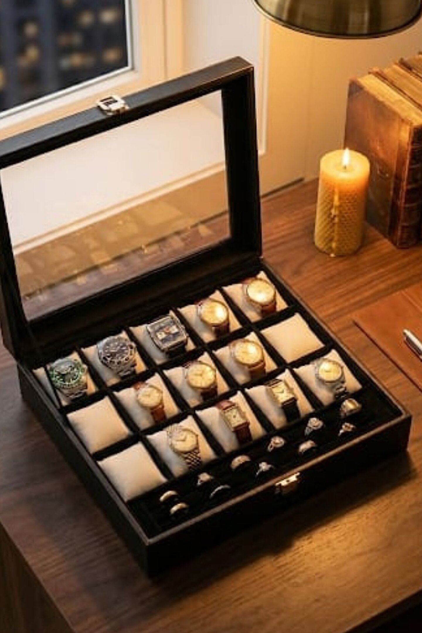 Büyük Kapasite: 15 adet saatiniz için özel yastıklı bölmelerin yanı sıra, yüzük, küpe ve diğer küçük takılarınız için geniş alt bölmelere sahiptir.