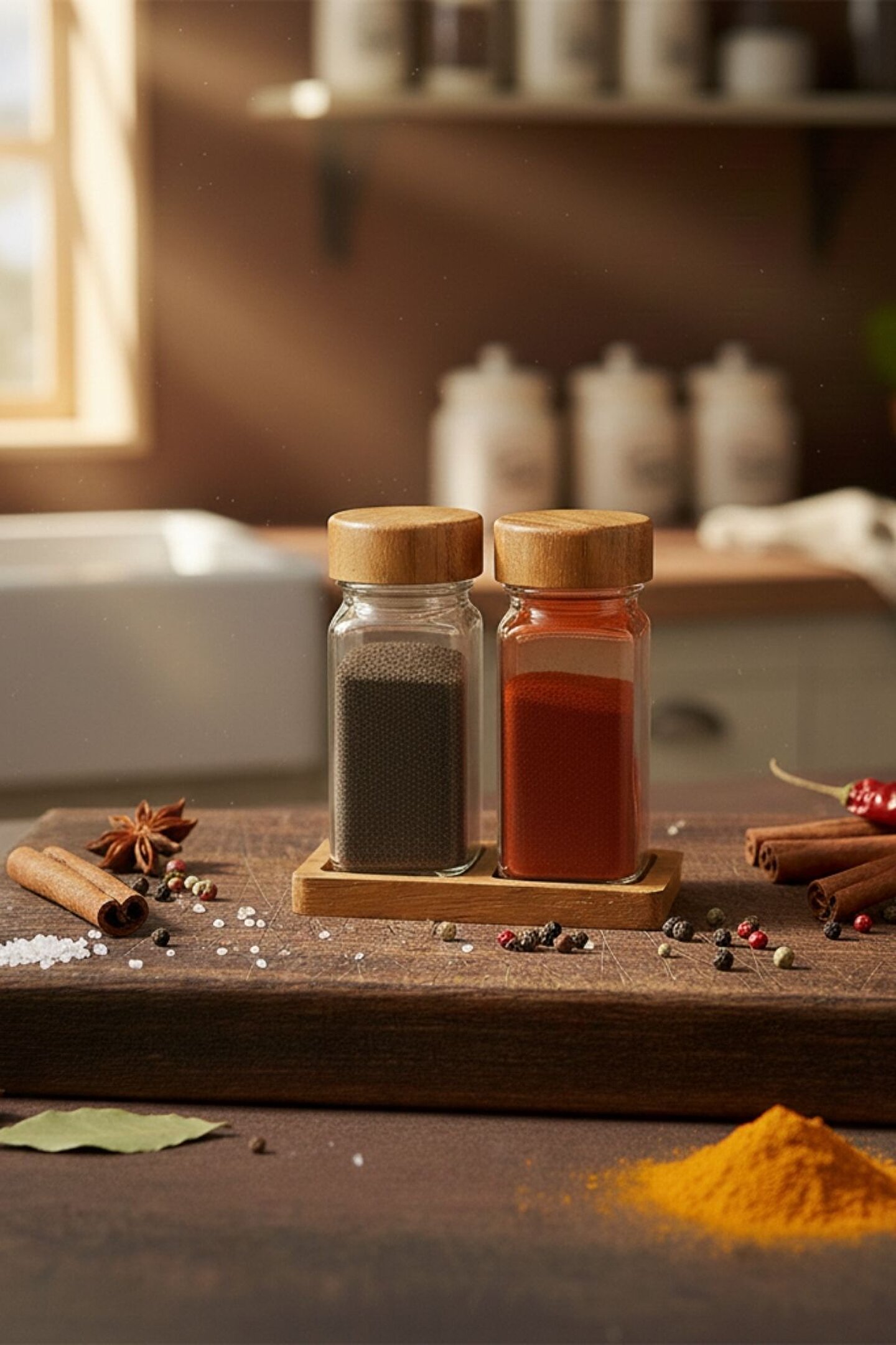 Bambu Kapaklı ve Standlı İkili Cam Baharatlık Seti - 120 ml