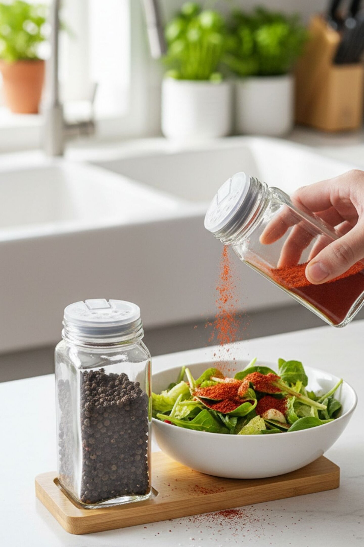 Pratik Kullanım (Delikli İç Kapak): Cam kavanozların altında bulunan şeffaf delikli aparat, yemek yaparken baharat miktarını kolayca kontrol etmenizi sağlar.