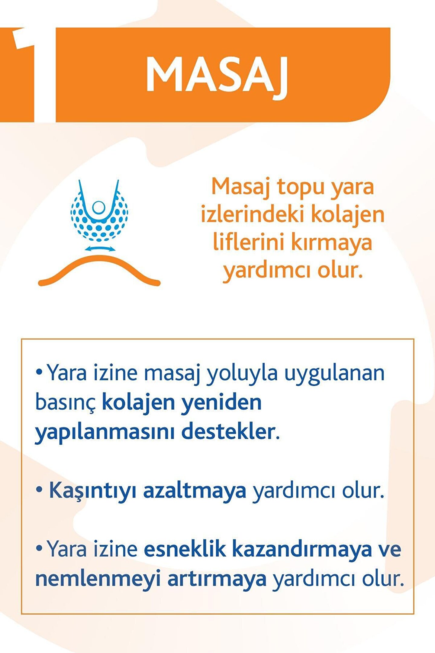 Yara cildin derin tabakalarını etkilediğinde oluşumu riski vardır ancak doğru destekle son görünüşü mümkün olan en iyi hale getirilebilir.; Bepanthol®Anti-Scar Jel'in inovatif formülü ameliyat ya da yaralanmalardan sonra oluşabilecek yara izlerini önlemeye ve gidermeye destek olmak için özel olarak tasarlanmıştır.; Bepanthol®Anti-Scar Jel yara izlerinin kızarık ve kabarık görünümünü azaltmaya yardımcı olur.; Kaşıntıyı azaltmaya yardımcı olur.; Cildi nemlendirir.; Erişkinlerde ve çocuklarda kullanılabilir.; Bepanthol®Anti-Scar Jel Kullanımı: Bir aydan kısa süredir kapalı olan yaralar: (1) Yaranın tamamen kapalı olduğundan emin olun.; Açık yara üzerinde Bepanthol®Anti-Scar Jel kullanmayın.; Temiz bir uygulama için ellerinizi yıkayınız.; Jeli, parmağınızla yumuşak dairesel bir hareketle yara izine uygulayın.; Hassas cilde çok fazla baskı uygulamamaya dikkat edin.; En az iki ay boyunca, günde iki kez uygulayın.; Bir aydan uzun süredir kapalı olan yaralar: (1) Bu aşamada cilt daha az hassas olacağından dolayı Bepanthol®Anti-Scar Jel ile birlikte gelen masaj topunu kullanabilirsiniz.; Ellerinizin ve masaj topunun temiz olduğundan emin olun.; Masaj topunu az basınç ile yaraya hafifçe masaj yapmak için kullanın.; Masajdan sonra jeli uygulayın.; Bunu günde iki kez en az iki ay süreyle devam ettirin.; Bepanthol®Anti-Scar Jel ne zaman kullanılmaz? (1) Açık yaralar ve mukozada (örn.; ,ağız- burun içinde) kullanmayın.; Göz çevresinde kullanmayın.; İçeriğindeki herhangi bir bileşene karşı bilinen alerjiniz varsa kullanmayın.; Yalnızca harici kullanım içindir.; Ürün Detayları: Yara izlerini daha görünür yapan faktörlerden birisi kuru cilttir, bu nedenle yara görünümlerini en aza indirmek için yapabileceğiniz en iyi şeylerden biri kuru cilt bölgesini nemli tutmaktır.; Bepanthol®Anti-Scar Jel, su kaybını azaltmak için yara yüzeyinde silikon bir film tabaka oluşturur.; Bir yara iyileşirken, doku kolajen üretir - aşırı kolajen fazla skarlaşma veya hipertrofik (yükselmiş) yara izlerine yol açabilir.; Cildin nemli tutulması, kolajen birikimini azaltmaya yardımcı olabilir.; Buna ek olarak, Bepanthol®Anti-Scar Jel ile birlikte gelen masaj topu, mekanik uyarılma yoluyla kolajen liflerinin kırılmasına yardımcı olur.; Bepanthol®Anti-Scar Jel oluşumu ve yönetimi konusundaki son önerilerin ışığında geliştirilmiştir.; Kızarık, kabarmış yara izini azaltmaya üç yolla yardımcı olur; Özel silikon jel yara izini kapatan bir film tabakası oluşturur, yeni oluşan derinin kurumasını önleyerek nem dengesinin muhafaza edilmesine yardımcı olur.; Pantenol gibi nem tutucular nem dengesini desteklemeye yardımcı olur.; Masaj topu eski yara izlerinde ciltteki kolajen lifleri kırmaya yardımcı olur.; Referanslar BepantholAnti-Scar Jel Kullanma Talimatı Stettler H et al.; Clinical innovation: Treatment with an anti-scar gel and massage ball improves physical parameters of hypertrophic scars.; Wound Int 2016;7(3):18-23. Puri N et al.; The Efficacy of Silicone Gel for the Treatment of Hypertrophic Scars and Keloids.; Cutan Aesthet Surg.; 2009;2(2):104–106. Ault P et al.; Scar massage for hypertrophic burns scarring—A systematic review.; Burns.; 2018 Feb;44(1):24-38. Brown A.; Wound Management 1: Phases of the wound healing process.; Nursing Times 2015; 111:12-13. Gold MH et al.; Updated International Clinical Recommendations on Scar Management: Part 1—Evaluating the Evidence.; Dermatol Surg 2014;40:817–824..