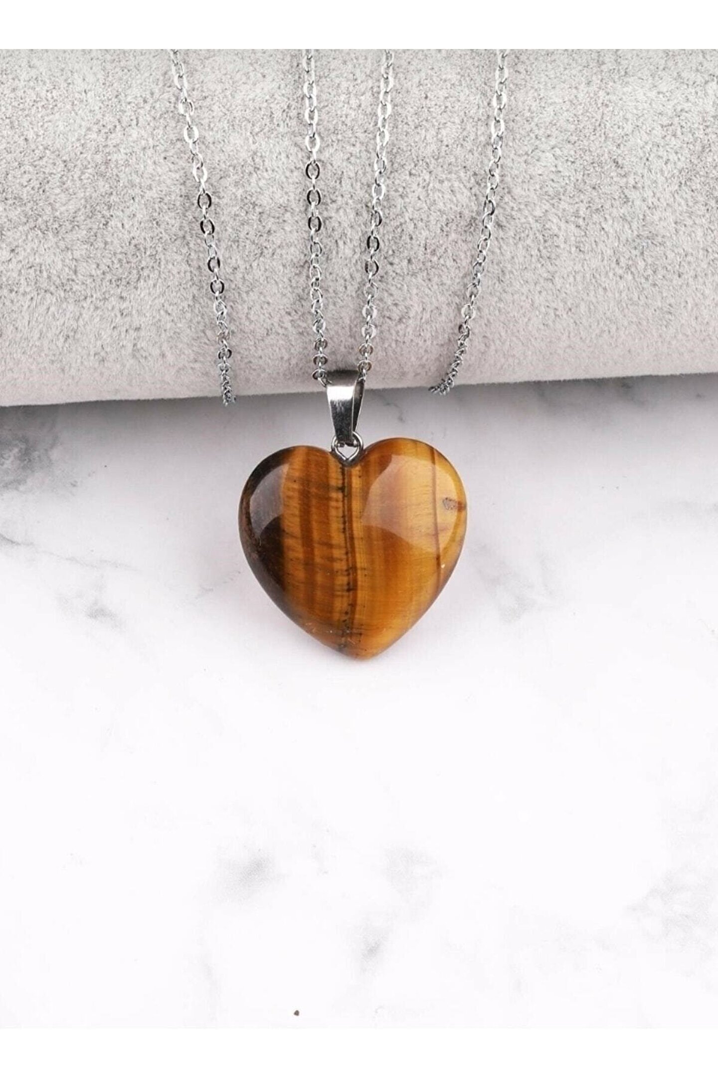 Kaplan Gözü Doğal Taş Kalpli Kolye