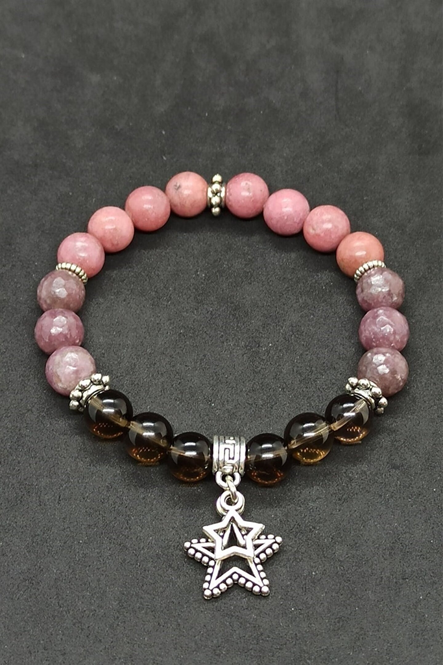 Dumanlı Kuvars Lepidolit Rodonit Doğal Taş Kadın Bileklik Dumanlı Kuvras: İyileştirici taşlar arasında yer alır. ; Sinir sistemini güçlendirir. ; Kişiye sakinlik verir. ; Kolay iletişim kurmanıza yardımcı olur. ; Odaklanmaya yardımcı olur. ; Tiroid bezini korur ve iyileştirici özelliği vardır. ; Radyasyona karşı koruyucudur. ; Sinirsel gerginliğe ve panik atak hastalığına iyi gelir. ; Lepidolit taşı: kişiye rahatlama ve huzur veren çok güçlü bir taştır. ; Bedeni dinlendirir. ; Güven ve kabullenme duygusunu geliştirir. ; Elle tutulduğunda kişiyi sakinleştirir. ; Endişe ve kuruntuyu giderir, mutluluk verir. ; Umutsuzluk ve bunalımları hafifletir. ; İyimserlik ve sabır verir. ; Bağımlılıkladan kurtulmaya yardımcıdır. ; Akıl,Zihin,Aşk,Güç sembolüdür ve kullananın bu özellikleri edinmesine yardım eder. ; Rodonit Taşı: ruhsal enerjiye sahiptir. ; Uyum ve huzur verir. ; Sorunlarla başa çıkmanıza yardımcı olur. ; Günlük yaşamda başarılı olmaya yardımcı olur. ; Ruhsal,zihinsel ve fiziksel canlılığınızı arttırır. ; Sınav öncesi stresi ortadan kaldırır.Zihin açıklığı verir. ; Öğrenme yeteneğini arttırır. ; Korkuyu azaltmaya yardımcı olur. ; Neşe,keyif,memnuniyet,aşk ve sevgi sembolüdür,kullananın bu özellikleri kazanmasına yardım eder. ; Boğaz ve gırtlak iltihaplarının tedavisine yardım eder. ; Anksiyete ve depresyon tedavisinde destek amaçlı kullanılmaktadır.;
