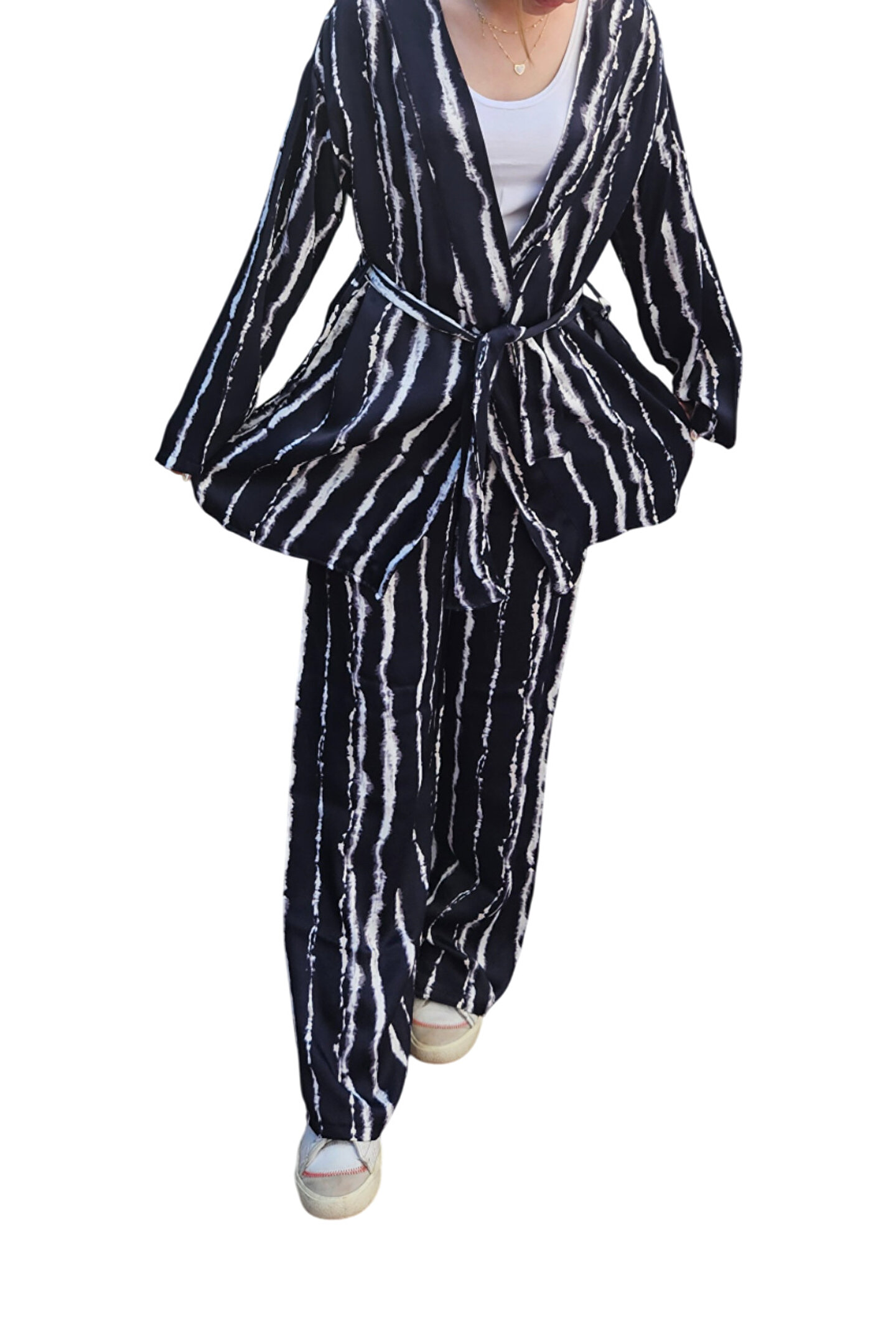 Günlük şıklığı ve rahatlığı bir arada sunan bu lacivert-beyaz desenli ikili takım, modern tasarımıyla dolabınızın vazgeçilmezi olacak.; Oversize kimono tarzı üst ve belden lastikli bol paça pantolon kombinasyonu sayesinde gün boyu konfor sağlar.; Hafif ve nefes alabilen kumaşıyla yaz aylarında ferah, mevsim geçişlerinde ise şık bir alternatif sunar.;