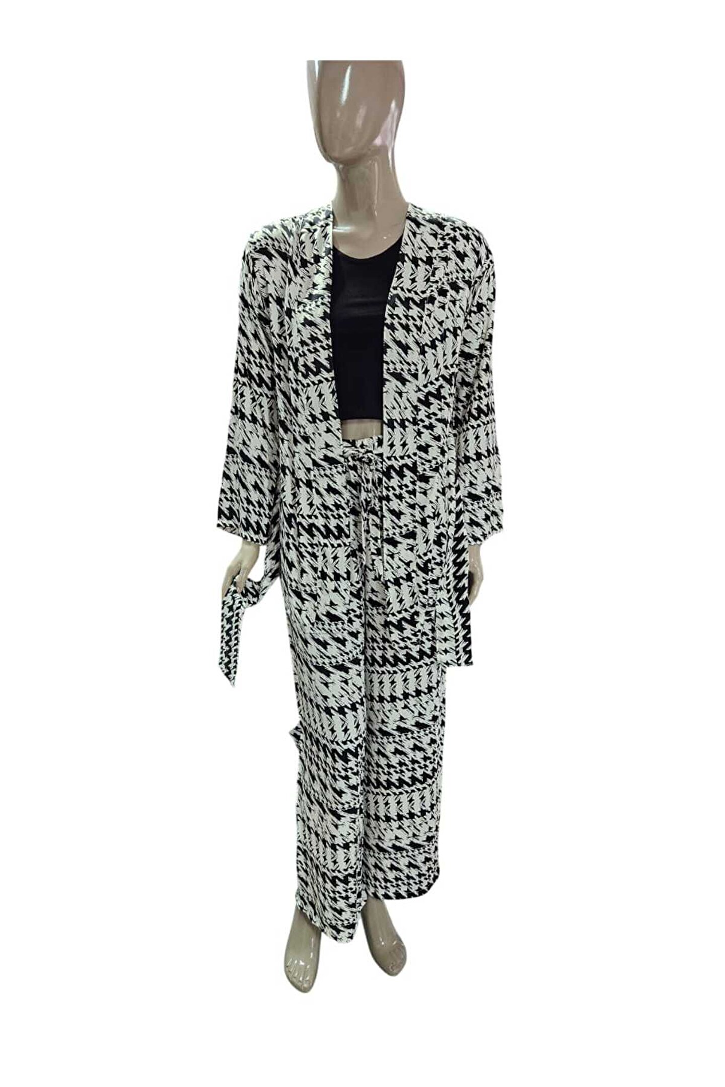 BESMOD Kadın Siyah-Beyaz Çizgili Desenli Salaş Takım (Kimono Ceket + Bol Paça Pantolon)