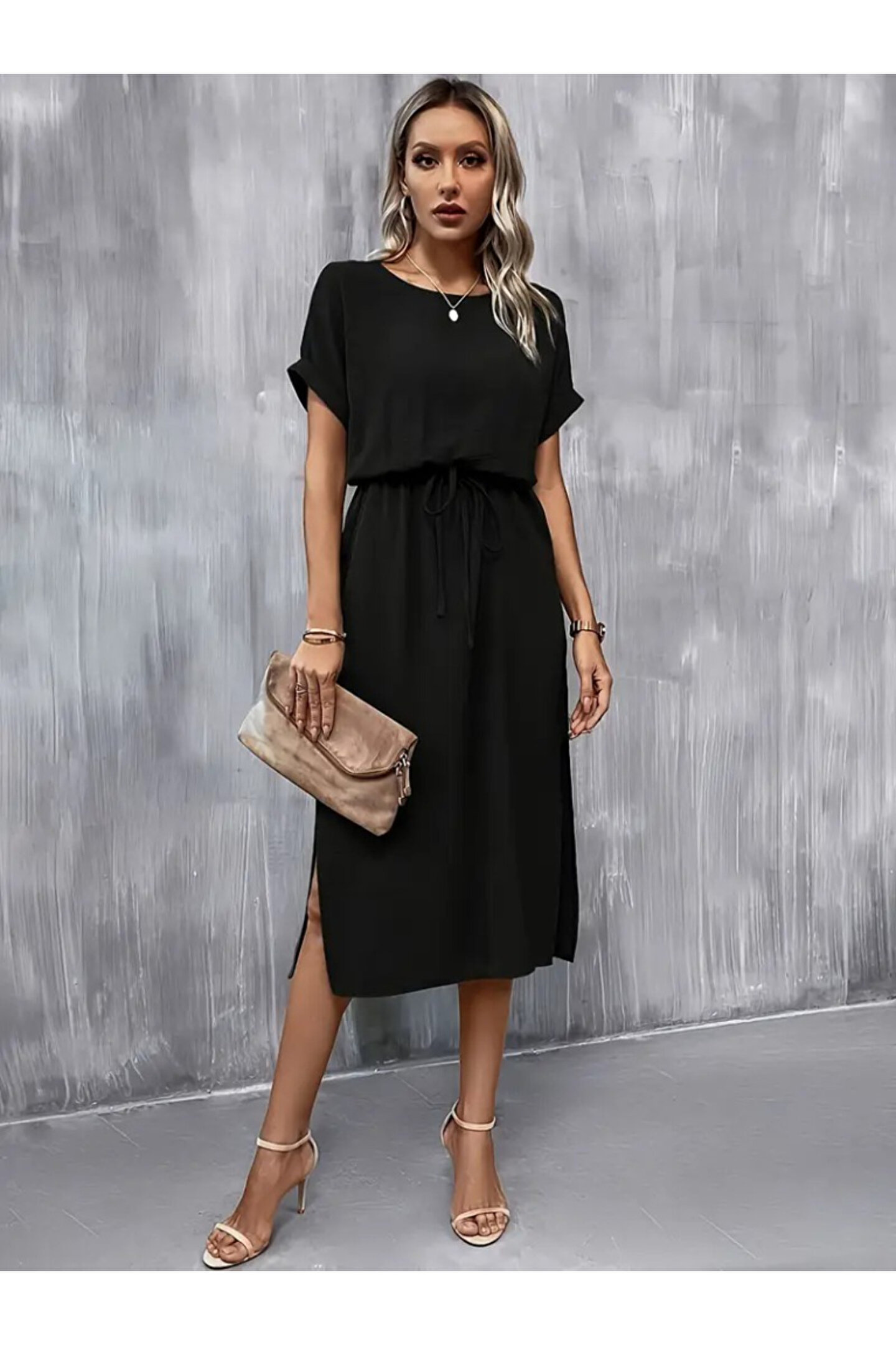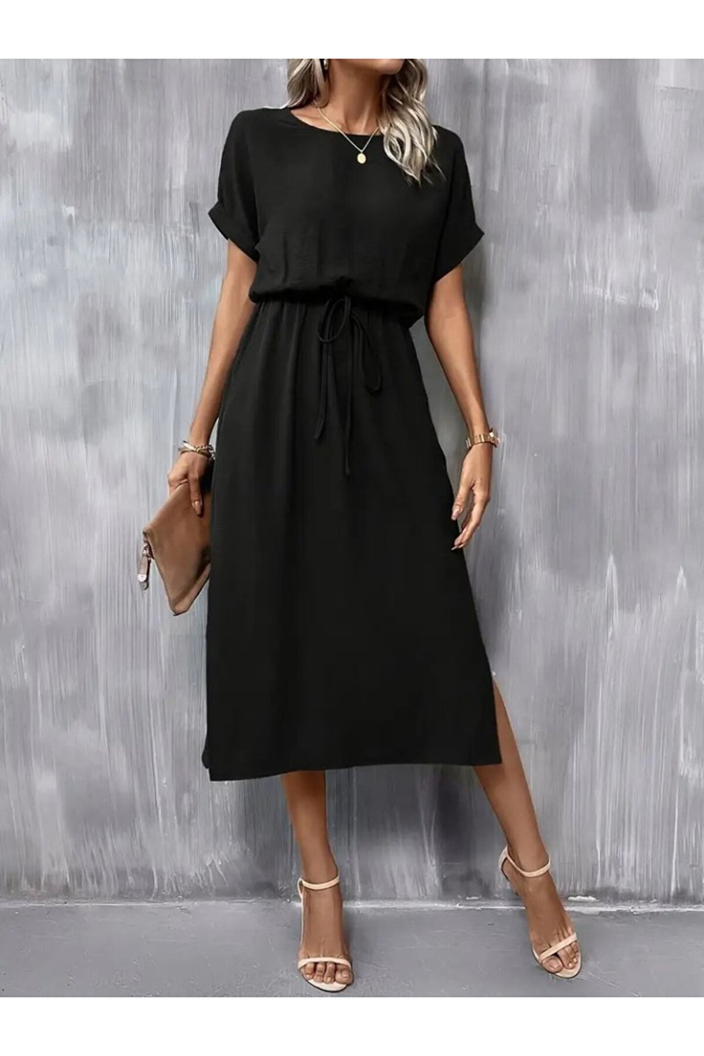 BETULAKSUBUTİK Kadın Kısa Kollu Yakası Açık Belden Bağlamalı Yırtmaçlı Viskon Elbise