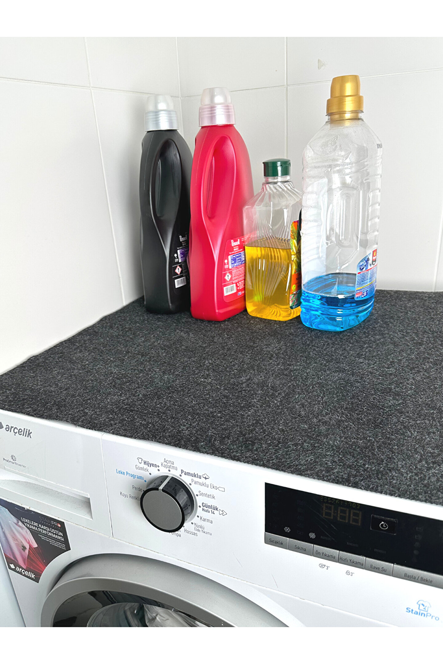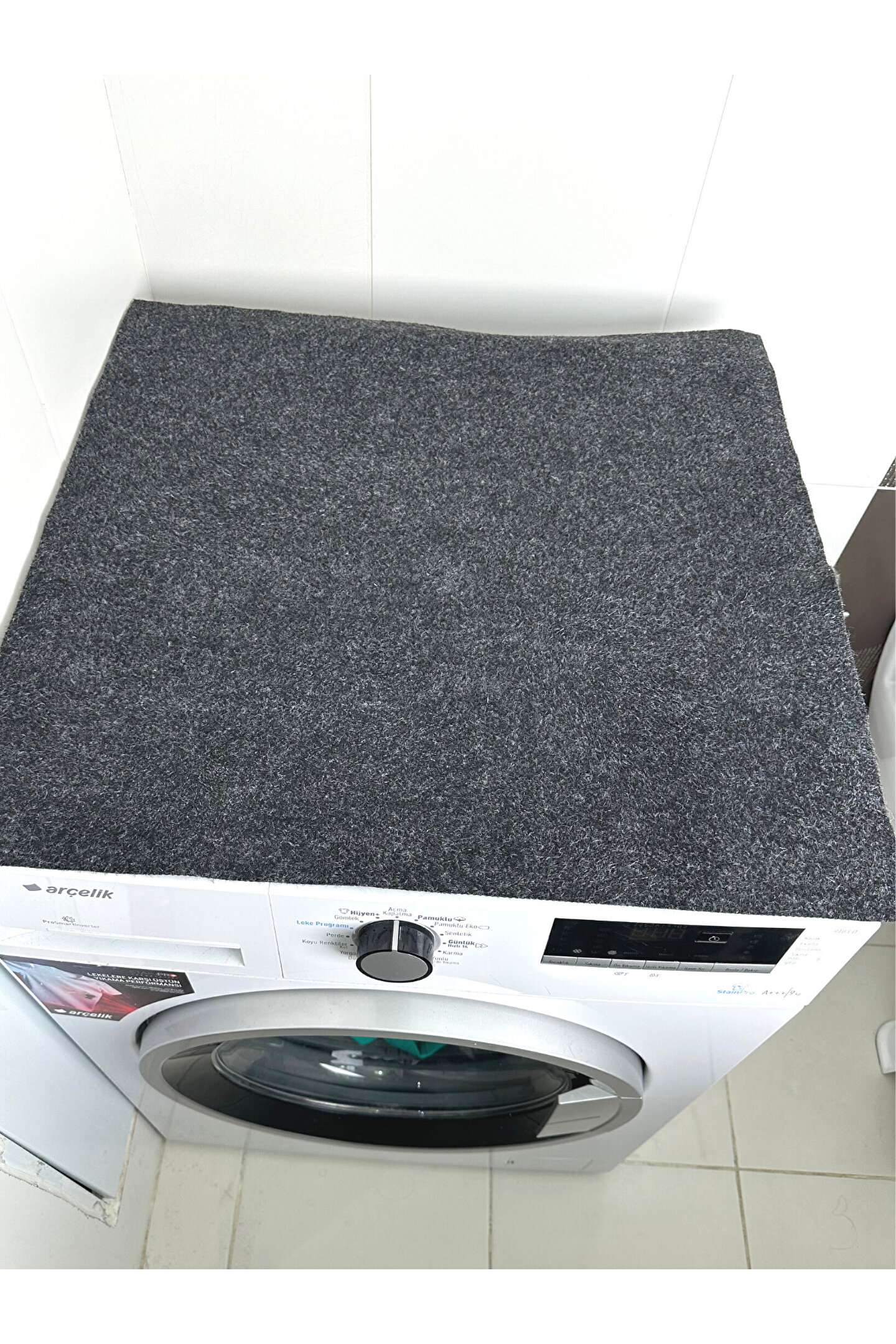 - Yüksek kaliteli polyester malzemeden üretilmiş, uzun ömürlü kullanım sunar.; - Kaymaz taban özelliği sayesinde çamaşır makinesinin kaymasını önler ve güvenli bir kullanım sağlar.; - Sıvı geçirmez yapıdadır, temizliği kolaydır.; - Antrasit rengiyle modern ve şık bir görünüm sunarken ev dekorasyonunuza uyum sağlar.; - Kolayca yıkanabilir olması pratiklik kazandırarak sık yıkama gerektiren alanlarda bile konforlu bir deneyim yaşatır.