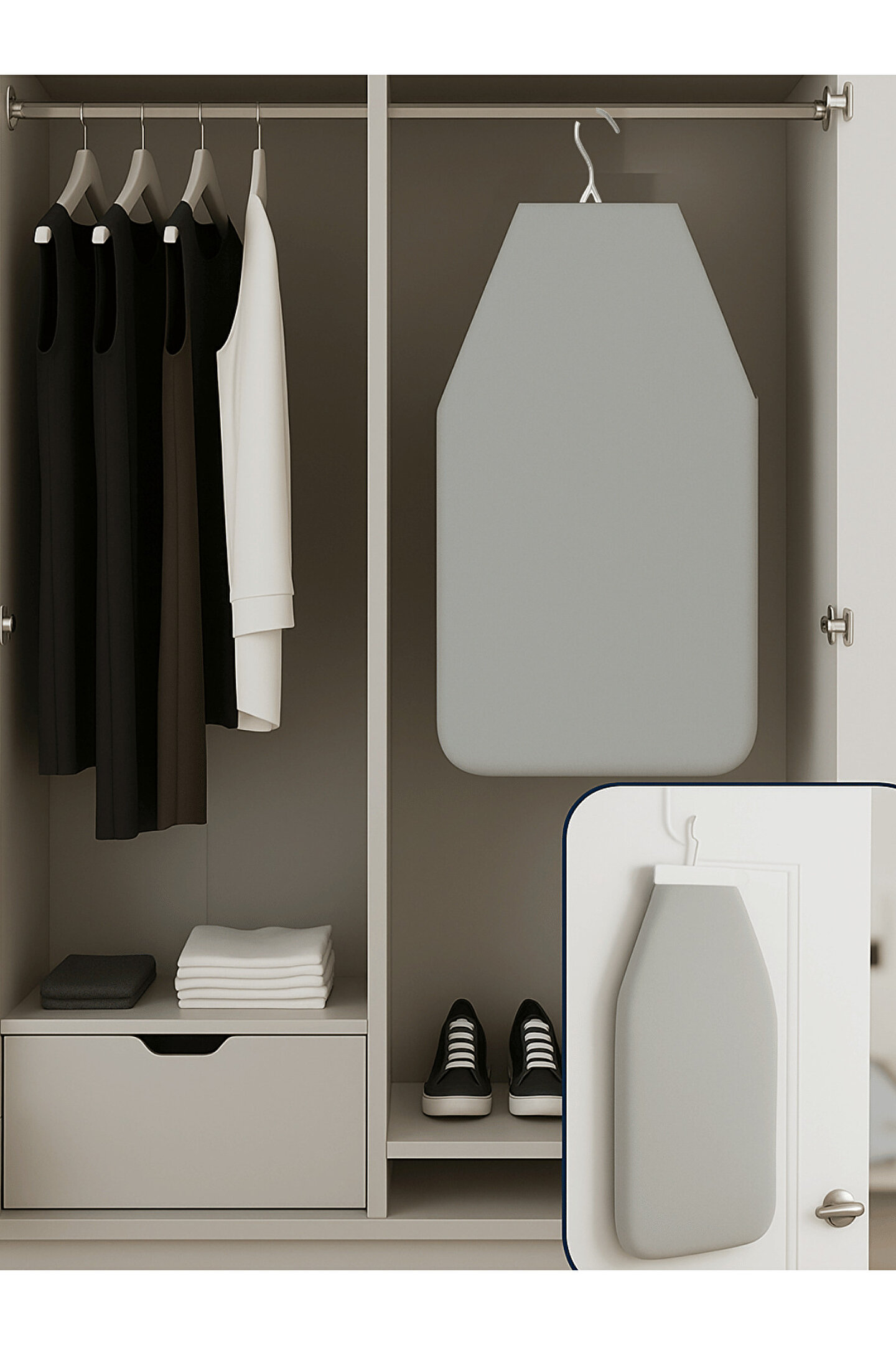 Entegre edilmiş pratik asma aparatı sayesinde depolama bir sorun olmaktan çıkar. İşiniz bittiğinde ayaklarını kapatın ve bu hafif ütü masasınıen uygun yere asarak ortadan kaldırın. Bu özellik, özellikle stüdyo daireler ve küçük evler için hayat kurtarır.