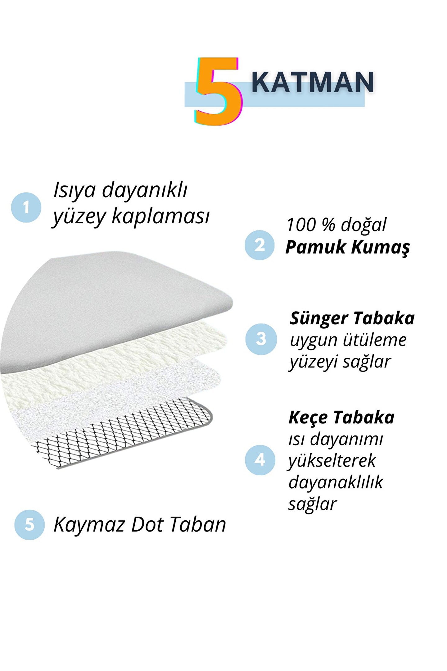 4 KATMANLI ÜTÜLEME MATI/KILIFI/ÖRTÜSÜ/BEZİ Ürün ölçüsü 53 cm en x 71 cm boydur.; ; Masa üzeri, yerde, halıda, yatakta vb tüm alanlarda rahatça ve hızlıca ütüleme yapabilirsiniz ; Ürün Gri Renktedir.; ; Malzeme: %100 Pamuk Kumaş, Kumaşta Silikon Kaplama, Sünger ve Keçe den oluşmaktadır.; ; Isı Dayanımı : 230 Derece ısıya kadar ütüleme dayanımı bulunmaktadır.; ; Yıkama: 30 Derece Hafif Yıkama Makinede yapılabilir.; Elde yıkama tavsiye edilir.; ; Laminasyon : Kumaş, Sünger ve Keçe birbirine laminasyon tekniği ile yapıştırılmaktadır.; Bu sayede üründe kayma olmaz ve buhar geçirgenliği maksimum seviyede olmaktadır.; Rahat bir ütüleme sayesinde elektrik tüketimini minumuma indiren enerji tasarruflu üründür.; ; ; 1. Katman Silikon Kaplama: Kumaşta kullanılan özel silikon apresi ile bölgesel yanık ve leke izlerini engeller.; ; 2.Katman Kumaş : % 100 Pamuk Dokumadır.; Ütüleme için özel üretilmektedir.; ; 3.Katman Sünger : 4 mm kalınlığında kalın süngerdir.; ; 4.Katman Keçe : %100 polyesterdir.; Geri dönüşüm keçesi değildir.; hammaddeden üretilmektedir.; Döküntü ve diğer hatalar ile karşılaşılmaz.; ; Kalın, Yüksek dolgulu, Türkiye standartlarının üzerinde, Premium kalite bulunan ürünümüz ile bugüne kadar ki yaşadığınız ütüleme deneyimini unutun.; Pürüzsüz yüzeyi, ısıya dayanıklılığı ve ütünün masası ve diğer tüm alanlarda üzerinde çok rahata kaydığını gördüğünüzde şaşıracaksınız.; Çevre dostu ve kimyasal kullanılmayan (Kanserojen madde ve asbestler) %100 Pamuk kumaştan üretilmiştir.; ; %100 Yerli ve Milli Üretim ve Markadır.; ;