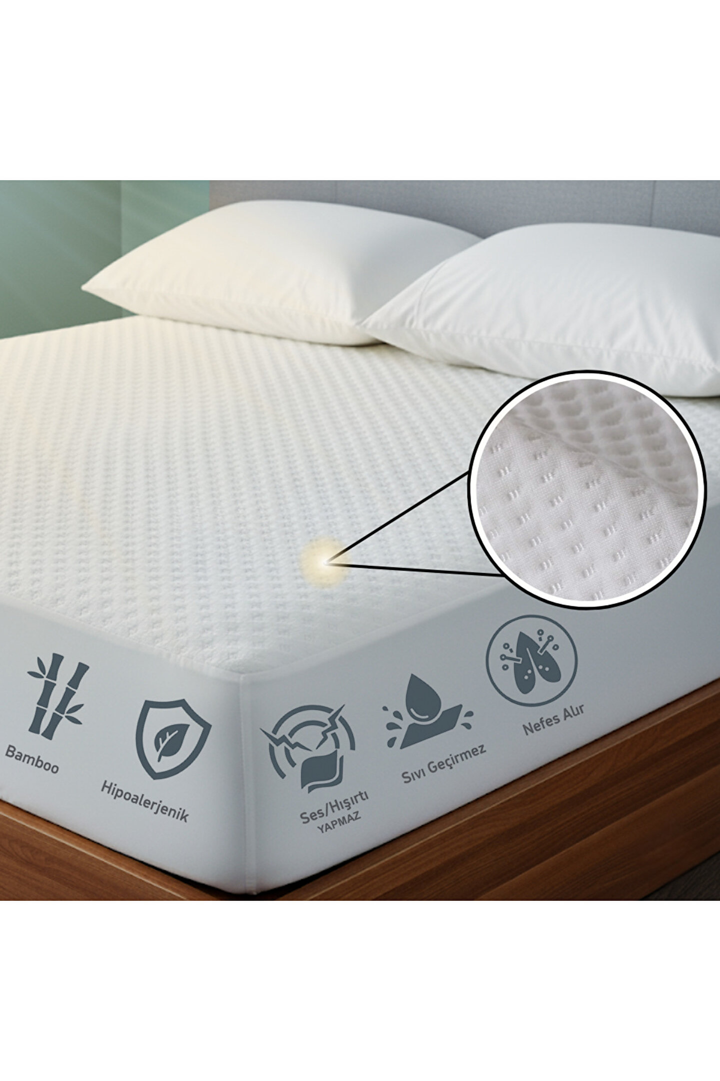 • Yatak ile temas eden özel membran yüzeyi sıvı geçirmezken hışırtı yapmaz, sessiz ve konforlu kullanım sağlar.