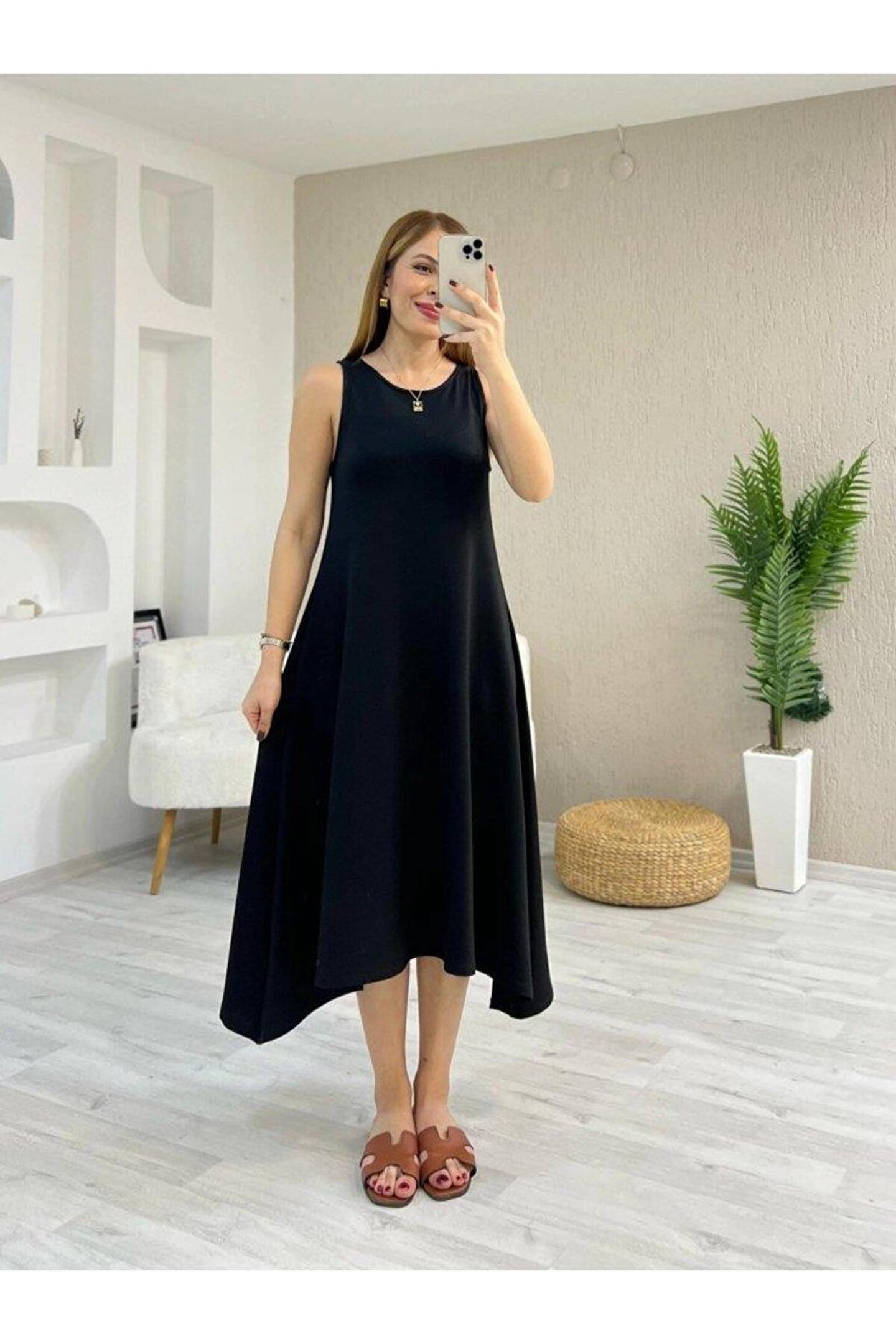 Kadın Askılı Yuvarlak Yakalı Asimetrik Kesim Detaylı Viskon Elbise