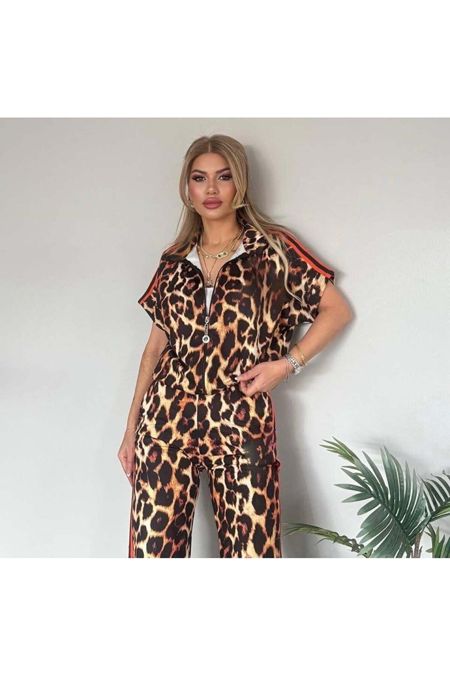 Kadın Dalgıç Kumaş Dijital Leopar Baskılı şerit Detaylı Takım