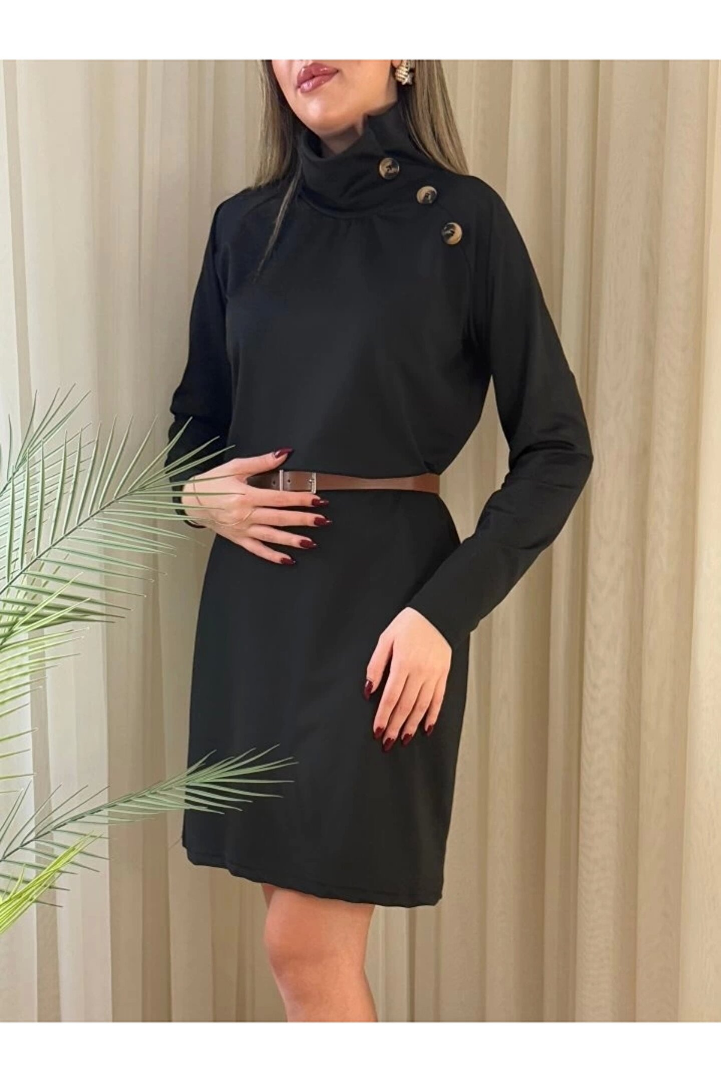 Bijuterria Kadın Uzun Kollu Balıkçı Yaka Düğme Detaylı Kısa şardonlu Dalgıç Elbise