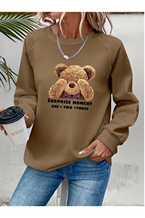 Kadın Uzun Kollu Bisiklet Yaka Ayıcık Desenli Viskon Iki Iplik Bluz