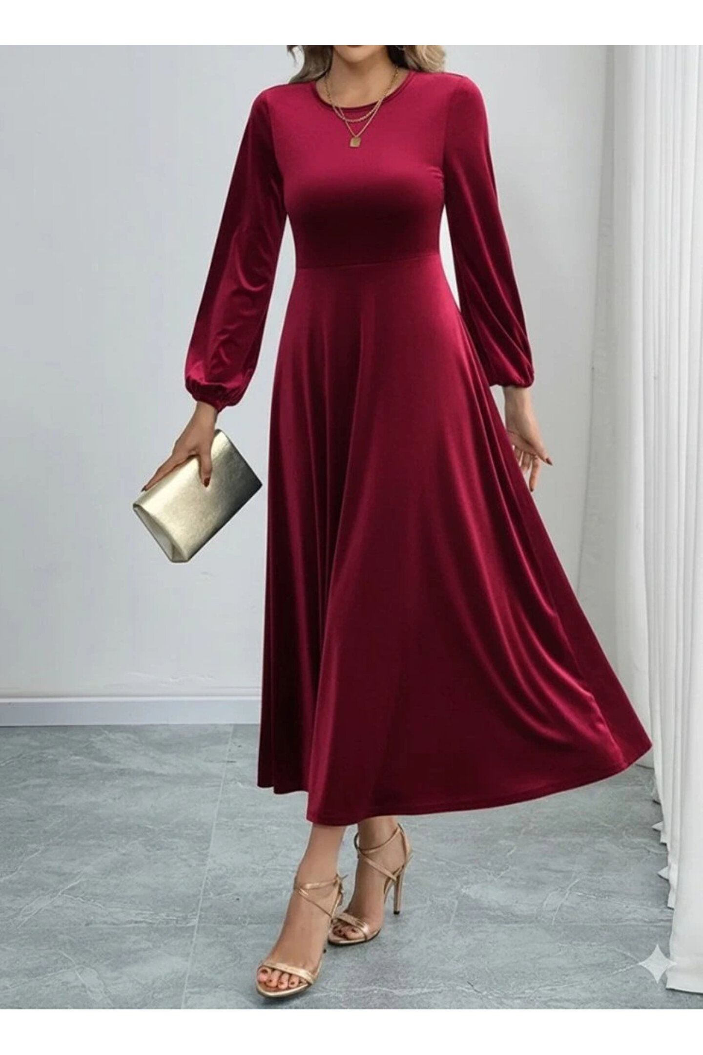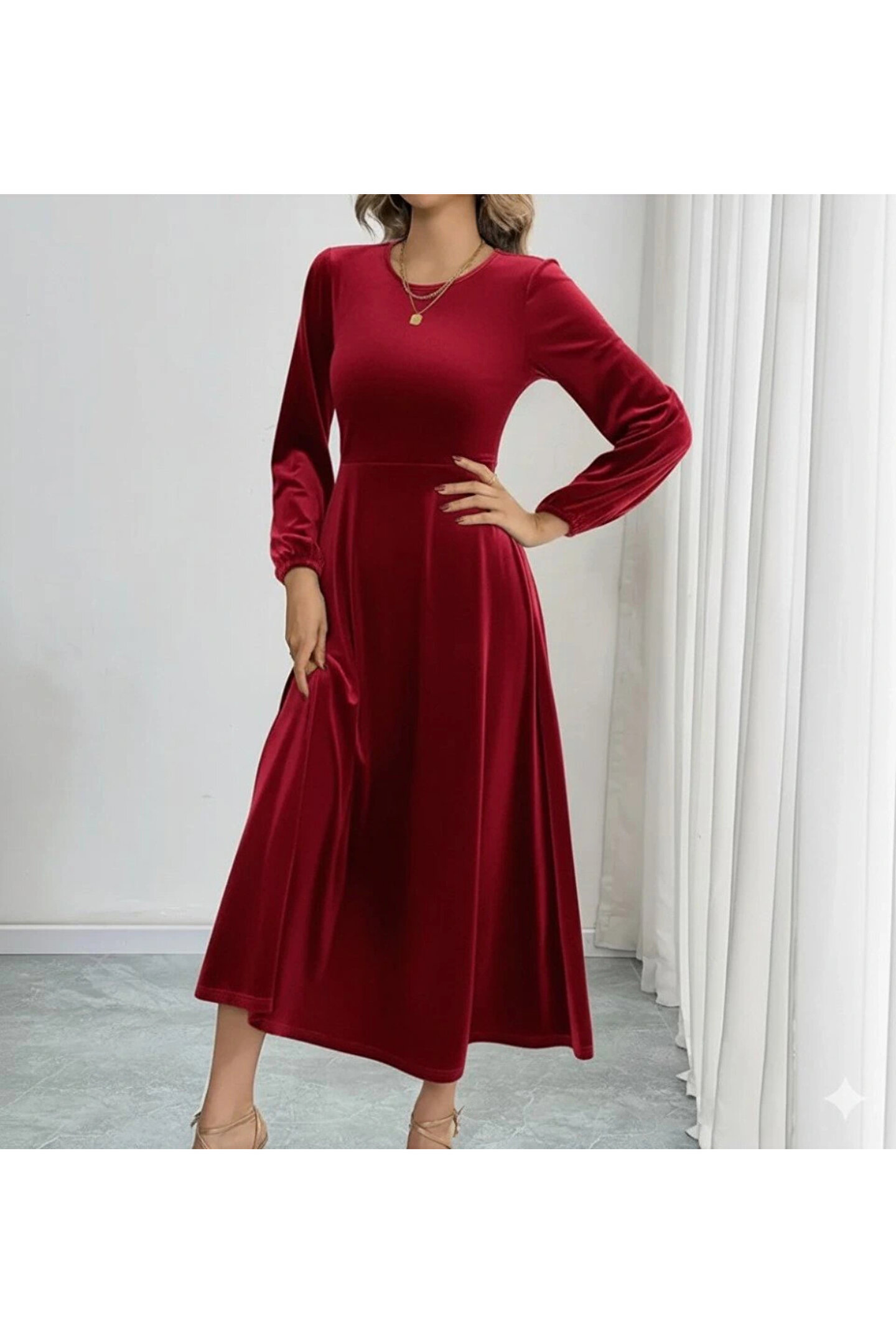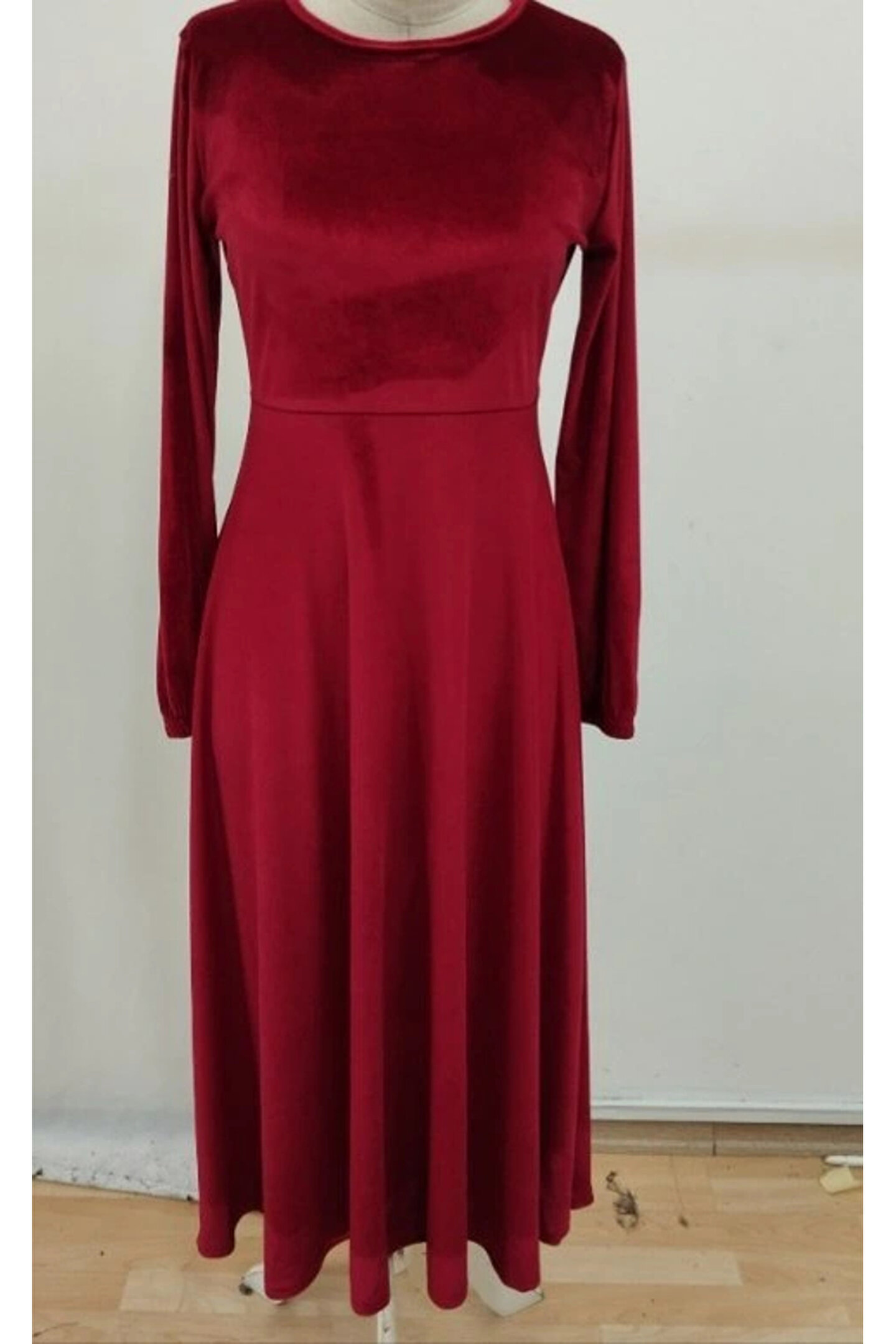 Bijuterria Kadın Uzun Kollu Bisiklet Yaka Midi Kadife Elbise