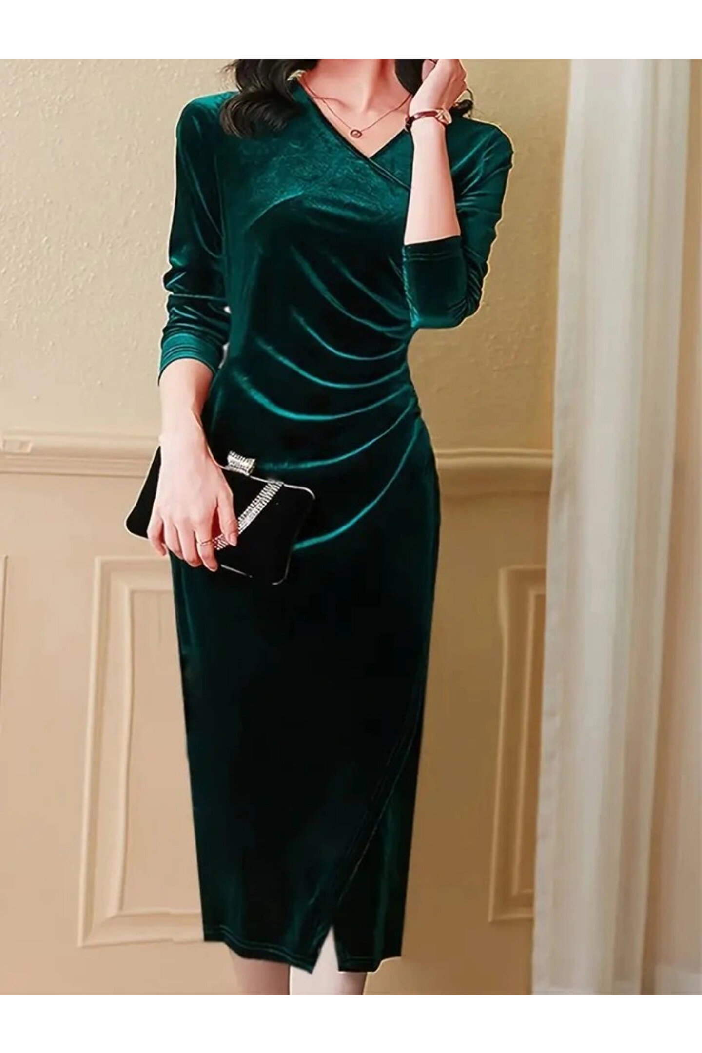 Kadın Uzun Kollu Kruvaze Yakalı Yandan Büzgülü önden çapraz Detaylı Midi Kadife Elbise