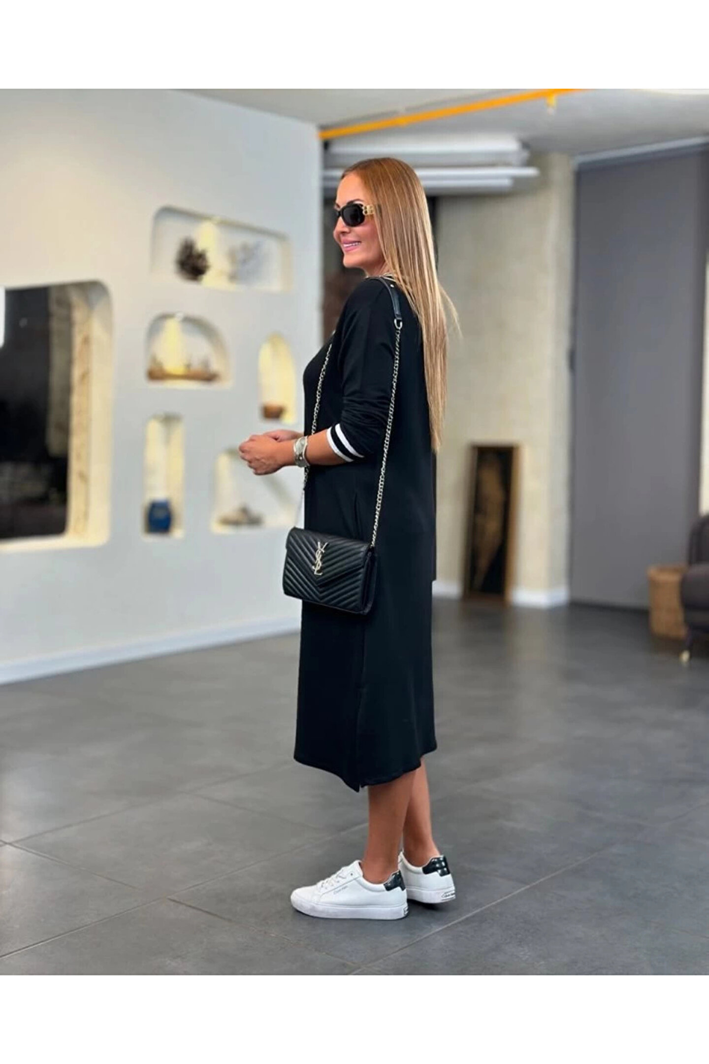 Kadın Uzun Kollu V Ribana Yakalı Yanlardan Yırtmaçlı Midi Viskon Iki Iplik Elbise