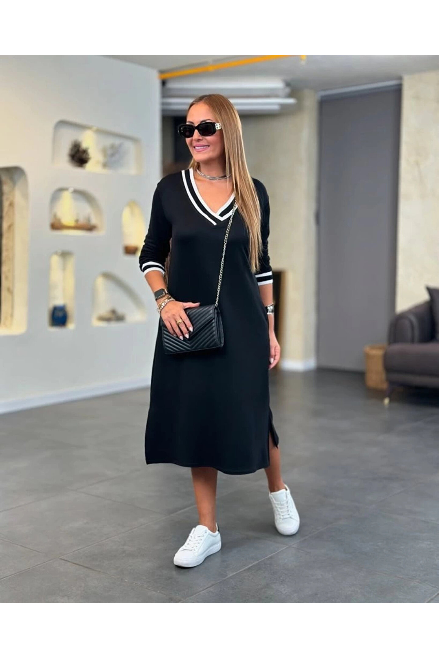 Bijuterria Kadın Uzun Kollu V Ribana Yakalı Yanlardan Yırtmaçlı Midi Viskon Iki Iplik Elbise