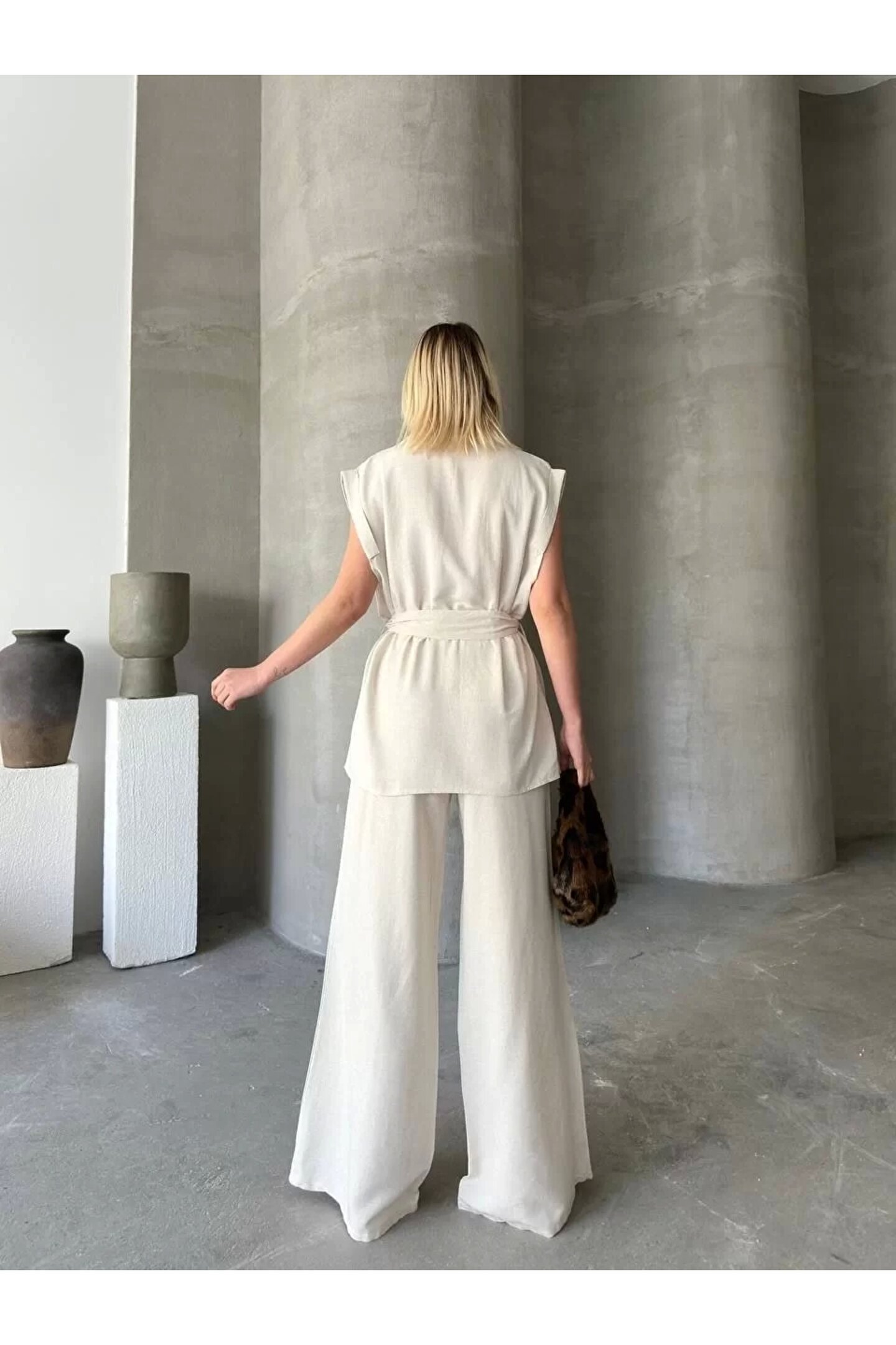 Keten Sıfır Kol Kuşaklı Ceket Pantolon Ikili Takım - Beyaz