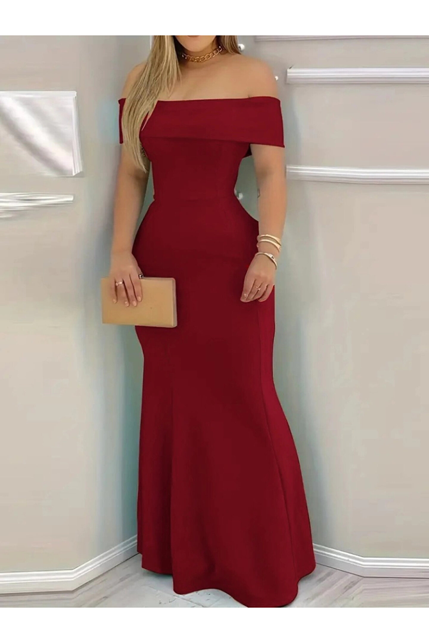 MDB Kadın Kısa Kollu Madonna Yaka Belden Oturtmalı Uzun Ithal Krep Elbise