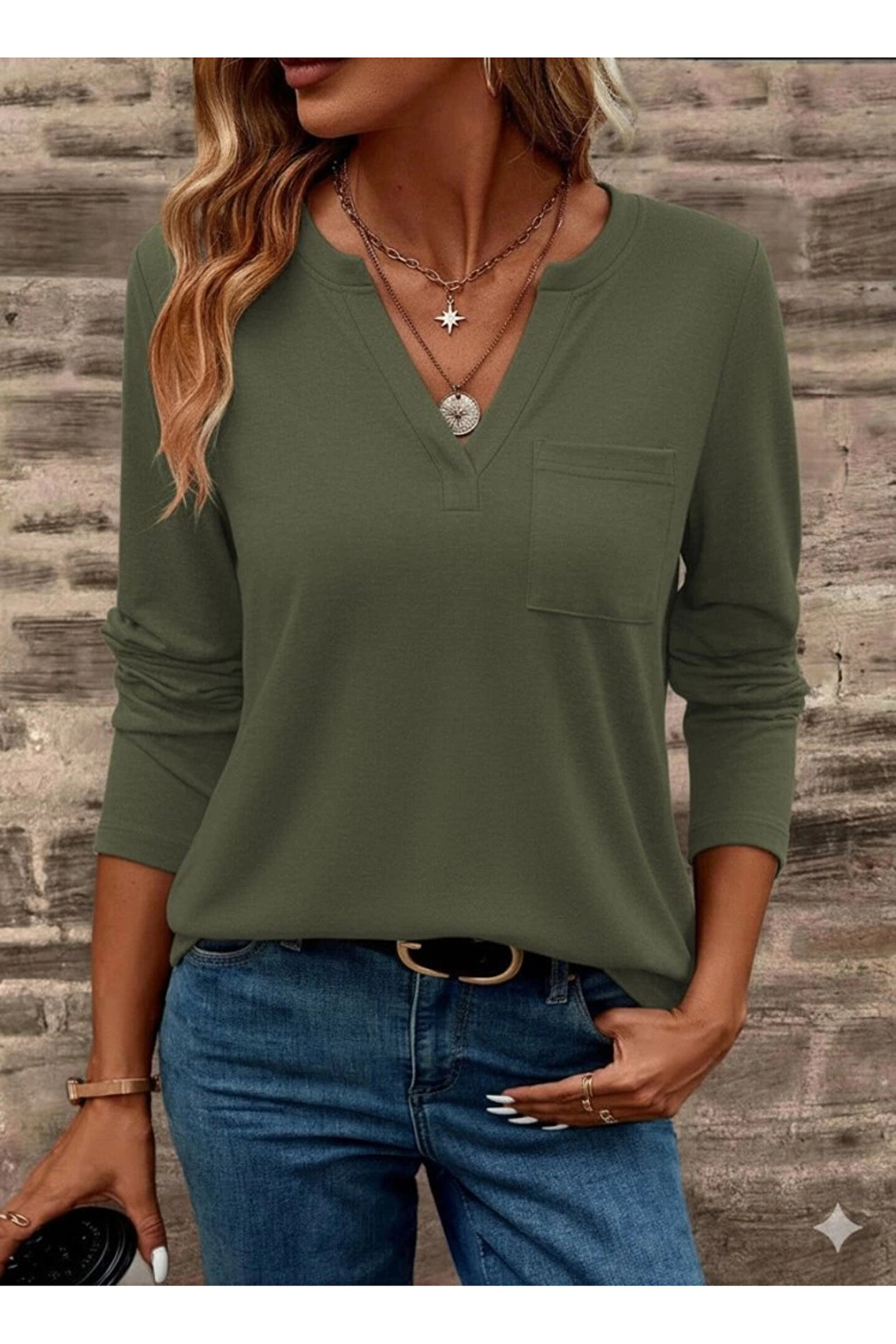 MDB Kadın Uzun Kollu Cepli V Yakalı Viskon Iki Iplik Bluz