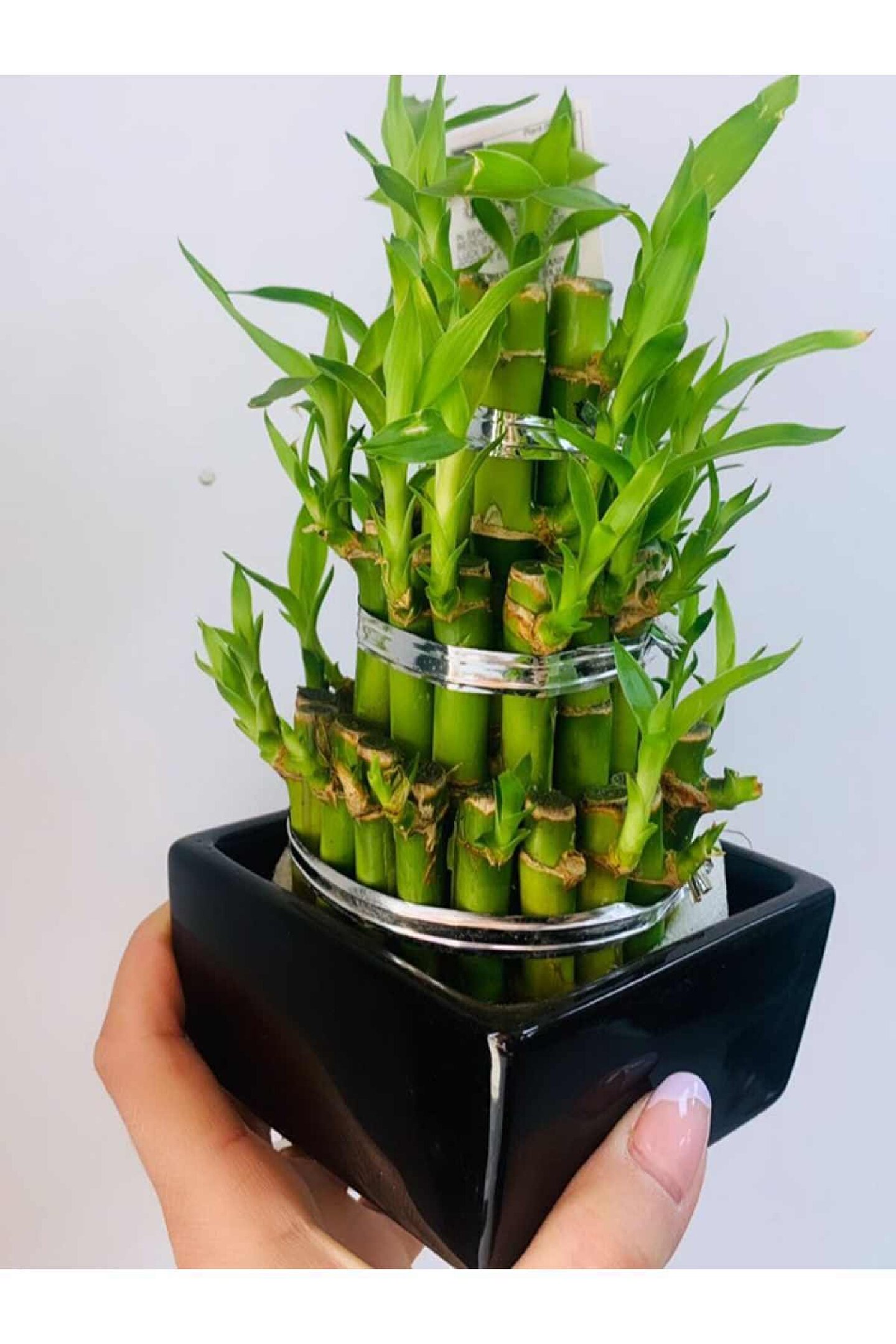 20 cm bitkili boyunda 10 cm çapında siyah saksısıyla şans bambusu
