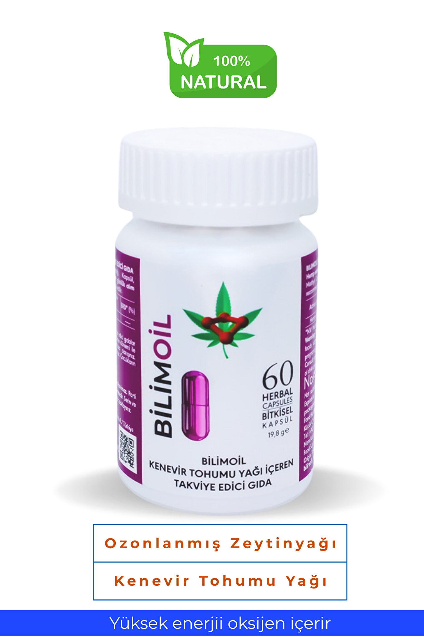 Yüksek enerjili oksijen ile zenginleştirilmiş, kenevir tohum yağı ve zeytinyağı içeren takviye edici gıda, kenevir tohumu yağı ve %100 ozonla zenginleştirilmiş soğuk sıkım zeytinyağından üretilmiştir.; İçeriğinde kimyasal ve koruyucu içermez.; Günlük kullanım miktarı 280 mg (2 adet)’dır.; Ürün düzenli kullanımda; vücudun antioksidan üretimini desteklemeye, metabolizmanın düzenlenmesine, bağışıklık sisteminin desteklenmesine, kanın oksijen taşıma kapasitesinin artmasına yardımcı olabilir.; Gıda takviyesinin kapsüllerinin üretilmesinde mor havuçtan elde edilen kapsüller kullanılmıştır.; Tamamen doğaldır.; Kullanım talimatlarına uygun olarak tavsiye edilen günlük porsiyonu aşmamak önemlidir; takviye edici gıdaların normal beslenmenin yerine geçemeyeceği unutulmamalıdır.; Hamilelik, emzirme dönemi veya hastalık durumlarında doktor tavsiyesi alınması gerekmektedir.; Ürünün saklanması için soğuk zincir koşullarında 4-20°C arası sıcaklıkta muhafaza edilmesi tavsiye edilir.; Çocukların ulaşamayacağı yerlerde saklanmalıdır.; Ürün 1 adet olarak gönderilecektir.